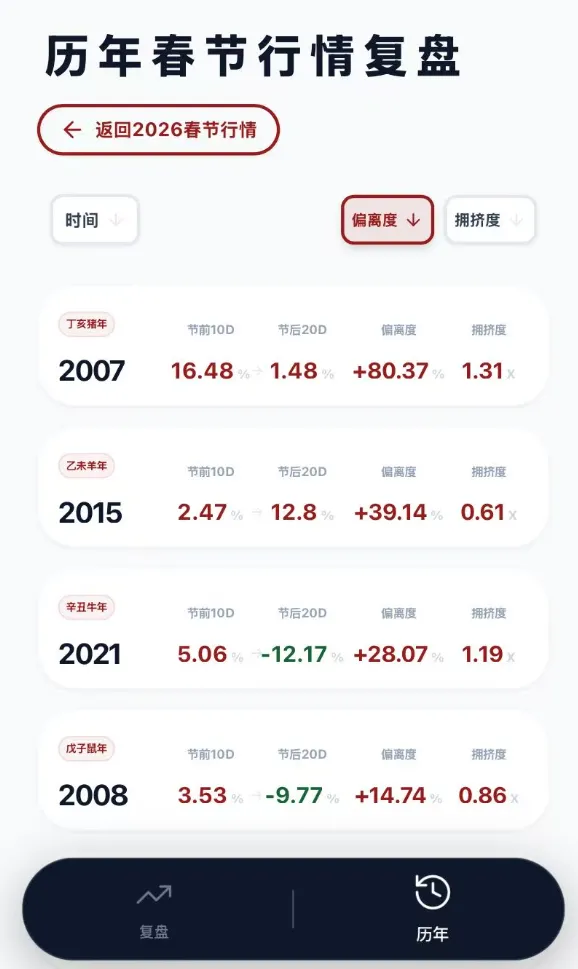 3、历年春节行情排序筛选,推荐使用 时间/偏离度/拥挤度 筛选器,查看六种筛选排序下的历年春节行情