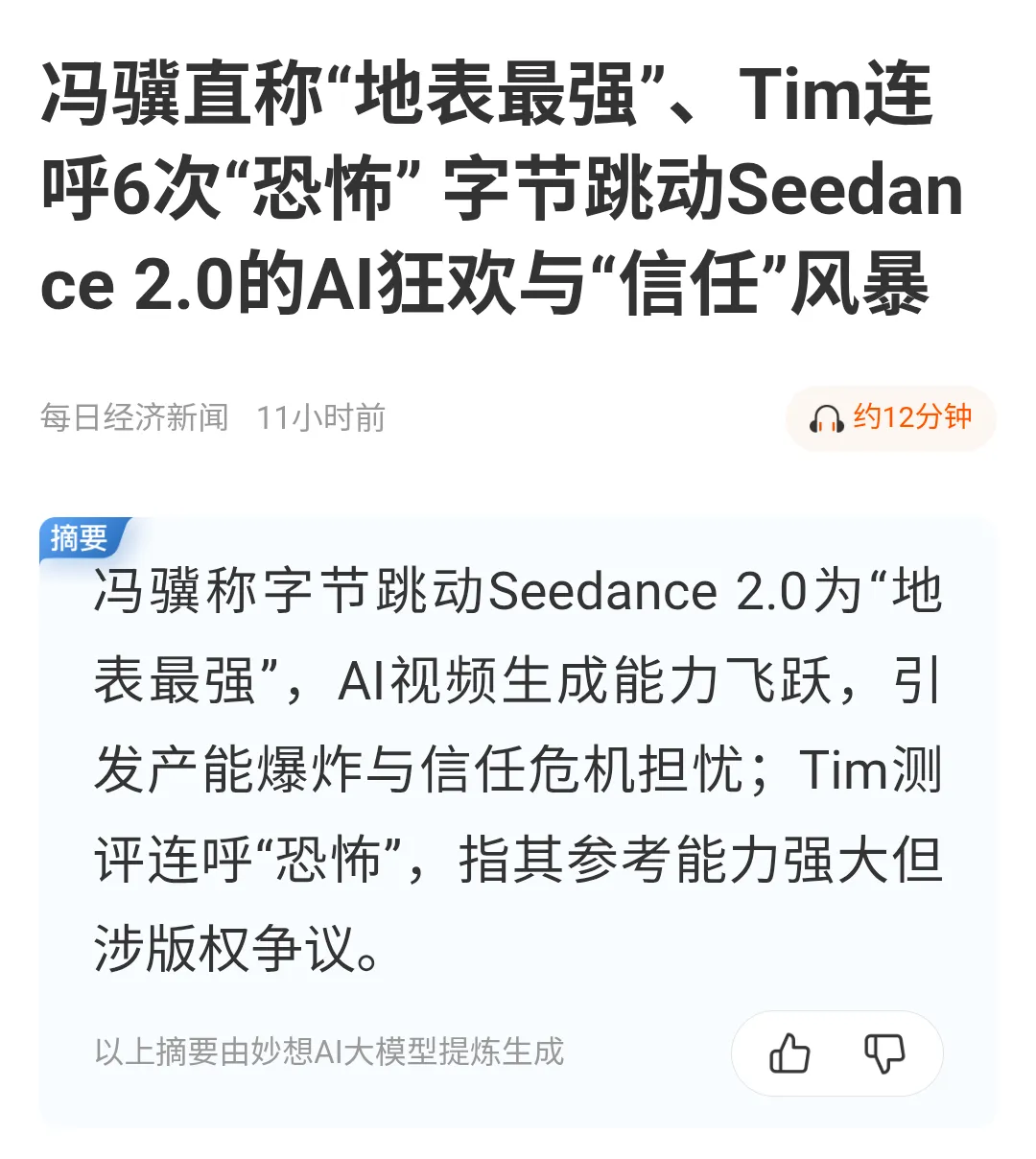 接下来的跟踪重心,应紧扣字节最新发布的AI视频模型 Seedance 2.0。