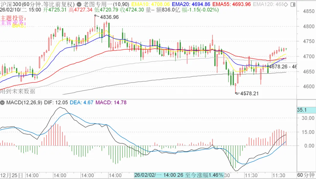 60分时股指程序系统跟踪指数正式更换为沪深300指数,目前股指正处于调整区域,从股指形态来看,横向的强势调整给市场较好的炒作空间,热点板块虽然轮换较快,但是能够保持市场上的人气与热度,这个也是股指正处于牛市标志之一
