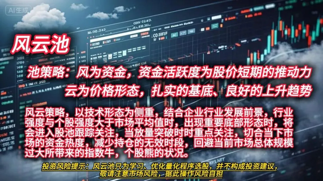 风云池的目的是让自已在复盘的时候减少工作量,毕竟目前五千多家公司,如果还象以前的选股,年过半百的自已真的吃不消,通过综合程序化筛选可以减少主观的影响,将选股范围进一步减少,也有利于精选心仪的目标,所以朋友们要注意,进入股池并不代表就一定是心仪的目标,还要结合基本面、成交量、综合趋势等进一步跟踪,这才能提高自已交易的成功率,一定要记住,交易的圣杯只存在于自已的认知当中,也只存在于自已的心中,切记!切记!切记!