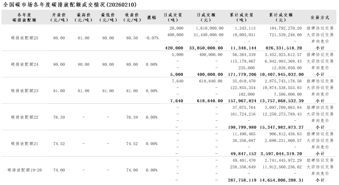 2026年1月1日至2月10日,全国碳市场碳排放配额成交量12,633,905吨,成交额928,560,251.80元。