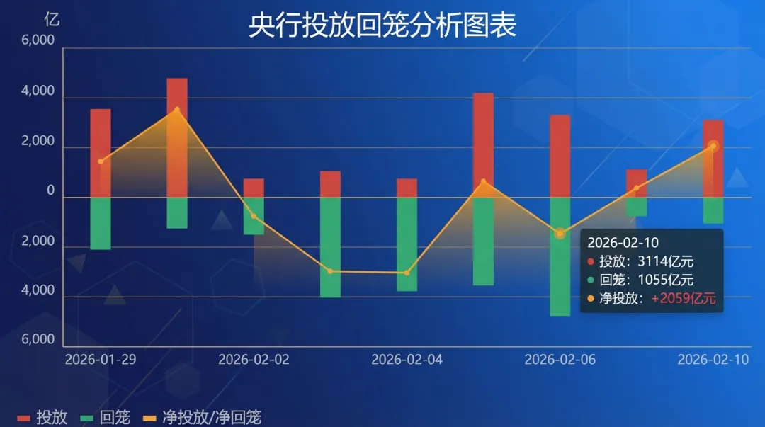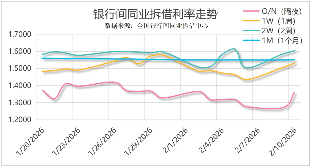 2 月 10 日,资金面边际收紧但仍可控,转贴现市场长端利率继续回落,而直贴端在企业集中贴现下承压上行,承兑汇票贴现利率呈现“转贴稳、直贴涨”的分化格局。为保持流动性合理充裕,央行今日开展 3114 亿元 7 天逆回购,并配合 1500 亿元国库现金定存,在 1055 亿元逆回购到期背景下,当日净投放 3559 亿元。