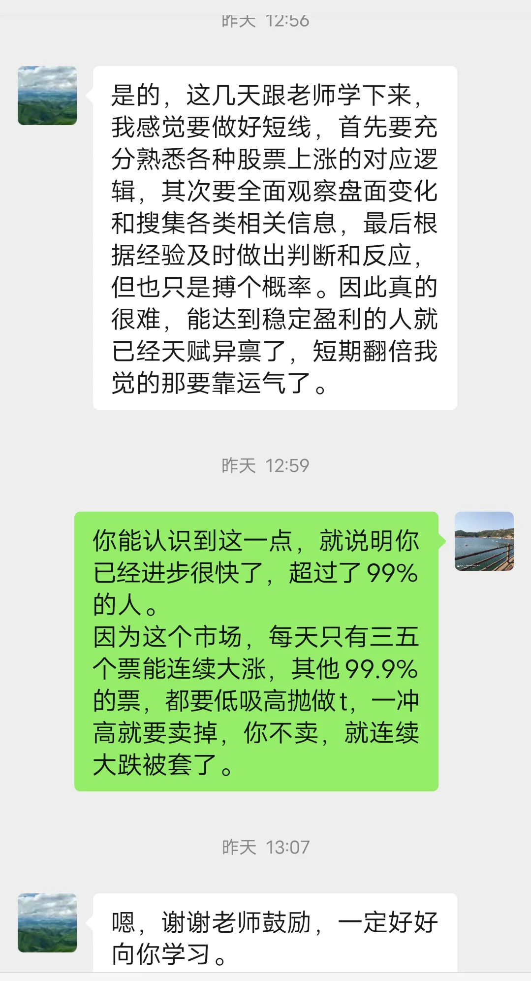 交易,是概率与风险的博弈,没有什么是必涨和必跌的,一切都是概率游戏。决定涨跌的,是市场环境变化和主力大资金的态度,不是我们的主观幻想,所以必须控制风险,具体操作上就是“坚持每天分仓3~5个票和简单统一的买卖点,也叫一致性操作。炒股就像上班一样,必须坚持统一标准,你今天上班明天不上班,今天工作明天不工作,这么随意能挣钱吗?同样的,如果你今天分仓明天不分仓、今天买明天不买、今天止损明天不止损、每天随意改变交易原则,这样能长期挣钱吗?”