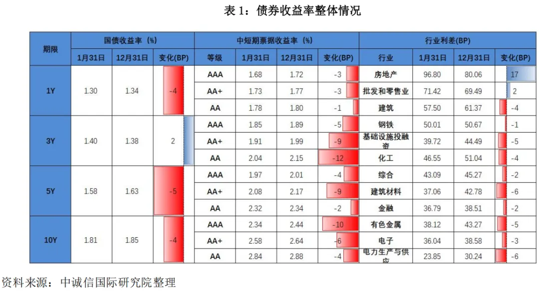 1月利率债和信用债收益率普遍下行。1月,央行持续呵护流动性,市场资金保持充裕,同时年初机构配置需求强劲,受银行、保险等机构开年配置需求释放等因素影响,债券收益率普遍下行。截至1月末,各期限国债收益率普遍下行,最大幅度不超过6bp,其中10年期国债收益率下行4bp至1.81%。信用债方面,信用债收益率全面下行,下行幅度在1bp-16bp之间。