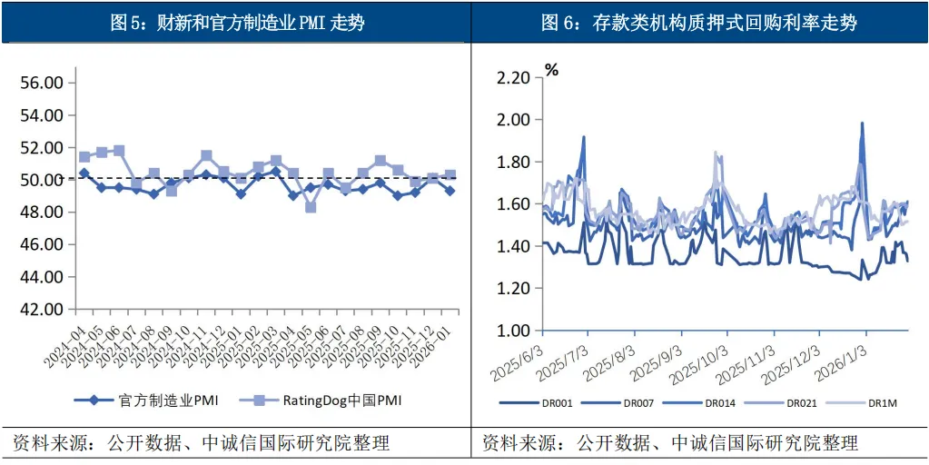 后续债市或继续呈“多空因素交织,区间震荡为主”的态势,策略上建议以中性偏积极立场和票息策略为基础,灵活把握结构性机会。展望后续,预计债市将延续震荡格局,经济基本面与货币政策环境为市场提供一定支撑,但机构行为和供给压力也构成上行制约,市场大幅单边行情的可能性较低。从经济基本面来看,基本面依然处在偏弱状态,PMI以及各分项指标大幅回落,尽管PPI和CPI等数据还未公布,但2月作为生产淡季,强劲的经济复苏信号难以出现,实体经济偏弱格局或将延续,同时需关注春节前季节性经营活动回落对出口及各项经济数据的影响。从资金面与货币政策来看,2月面临春节取现、政府债券集中缴款等短期流动性扰动,不过央行已通过重启14天期逆回购操作,并配合7天期逆回购及加量投放买断式逆回购等,明确释放呵护资金面、平滑波动性的信号,跨节流动性或将维持平稳。货币政策层面,央行明确提及降准降息有空间,考虑到前期政策效果有待观察,总量型货币政策工具在2月落地概率不高,其实际实施节点在一季度末的可能性较大。从机构行为来看,1月最值得关注的是年初配置盘全面发力,市场整体由净卖出转向积极净买入,主力由保险切换至中小行,助力债市“开门红”。公募基金等交易盘则表现谨慎,1月由上月的净买入转为净卖出,主要减持短端品种,转为集中配置信用票息资产。中长期看,商业银行作为债券市场的配置主力,其行为仍是长端利率的重要基础;不过在监管新规约束下,银行、债基等配置力量可能受到一定考验,保险机构有望在长端利率的边际定价中发挥更重要作用,同时考虑到基金费率新规也引导债券长期投资,未来市场机构可能会增配长端及超长端债券。