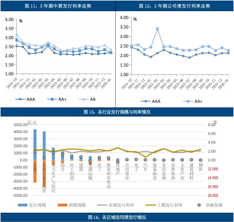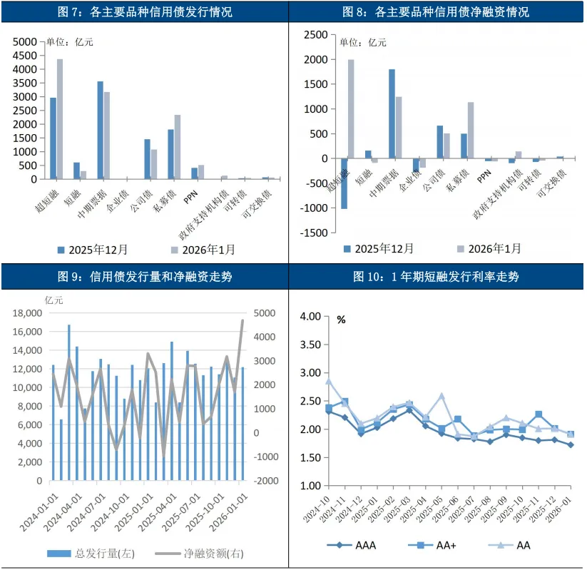 信用债发行规模有所收缩,收益率普遍下行,策略上建议建议以中性偏积极立场和票息策略为基础,灵活把握结构性机会。信用债一级市场小幅降温,发行规模降至1.37万亿元,净融资额增加,发行成本多数下行。受银行、保险等机构开年配置需求释放等因素影响,债券收益率普遍下行,10年期国债收益率下行4bp至1.81%。展望后市,预计后续债券市场将延续多空因素交织的区间震荡格局。经济基本面对债市形成支撑,1月PMI以及各分项指标大幅回落,叠加春节季节性影响,短期难现强劲复苏信号。货币政策与资金面保持宽松呵护态势,央行已通过多种工具平滑跨节流动性波动,并明确未来降准降息仍有空间,尽管总量政策在2月立即落地的概率不高,但宽松预期为市场提供信心。市场上行制约主要来自机构行为的分化与供给压力。机构行为方面,配置盘在年初积极入场,而交易盘则趋向谨慎,转向信用票息资产;同时,2月政府债券供给压力集中于节前,可能对资金面形成局部扰动。在此环境下,建议发行人优先考虑春节后发行,利用季节性配置行情并降低发行成本。对于投资者而言,建议投资者采取“中性偏积极”的立场,把握震荡市中的结构性机会,避免追涨杀跌,以票息策略为底仓,灵活参与波段交易。后续需重点关注春节后利率债供给节奏、1月经济金融数据、两会政策定调以及权益市场情绪变化等重要变量。