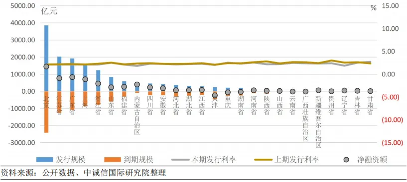 不同地区发行利率多数下行。分区域来看,北京地区信用债发行规模最高为3855.81亿元,江苏、广东、上海和江苏等地区信用债发行规模也相对较高。净融资方面,多数地区净融资为正,其中北京融资净流入规模最高,为1439.98亿元,广东、江苏等地区融资净流入规模相对较高,而天津融资净流出规模较大。发行成本方面,甘肃、宁夏和河南等地区平均发行利率较高,均超过2.5%;从利率变化趋势上看,多数地区平均发行利率有所下行,其中辽宁、陕西、贵州和内蒙古地区平均发行利率下行幅度较大,均超过50bp,其余省份平均发行利率下行幅度均在23bp以内。