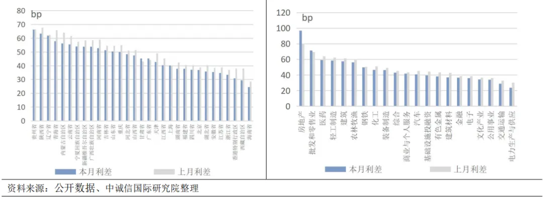 行业利差多数收窄。1月房地产、批发和零售业行业利差较高,均超过70bp;交通运输、电力生产与供应行业利差处于较低水平,均低于30bp。从变动趋势看,行业利差多数收窄,除房地产、批发和零售业利差分别走阔17bp和2bp外,其余各行业利差全面收窄,最大幅度为6bp。区域利差方面,贵州、陕西、辽宁等地区利差较高,均超过60bp;海南、西藏、香港等地区利差相对较低,处于26-31bp之间。从变动趋势看,上月区域利差普遍收窄,收窄幅度在1bp-9bp之间。