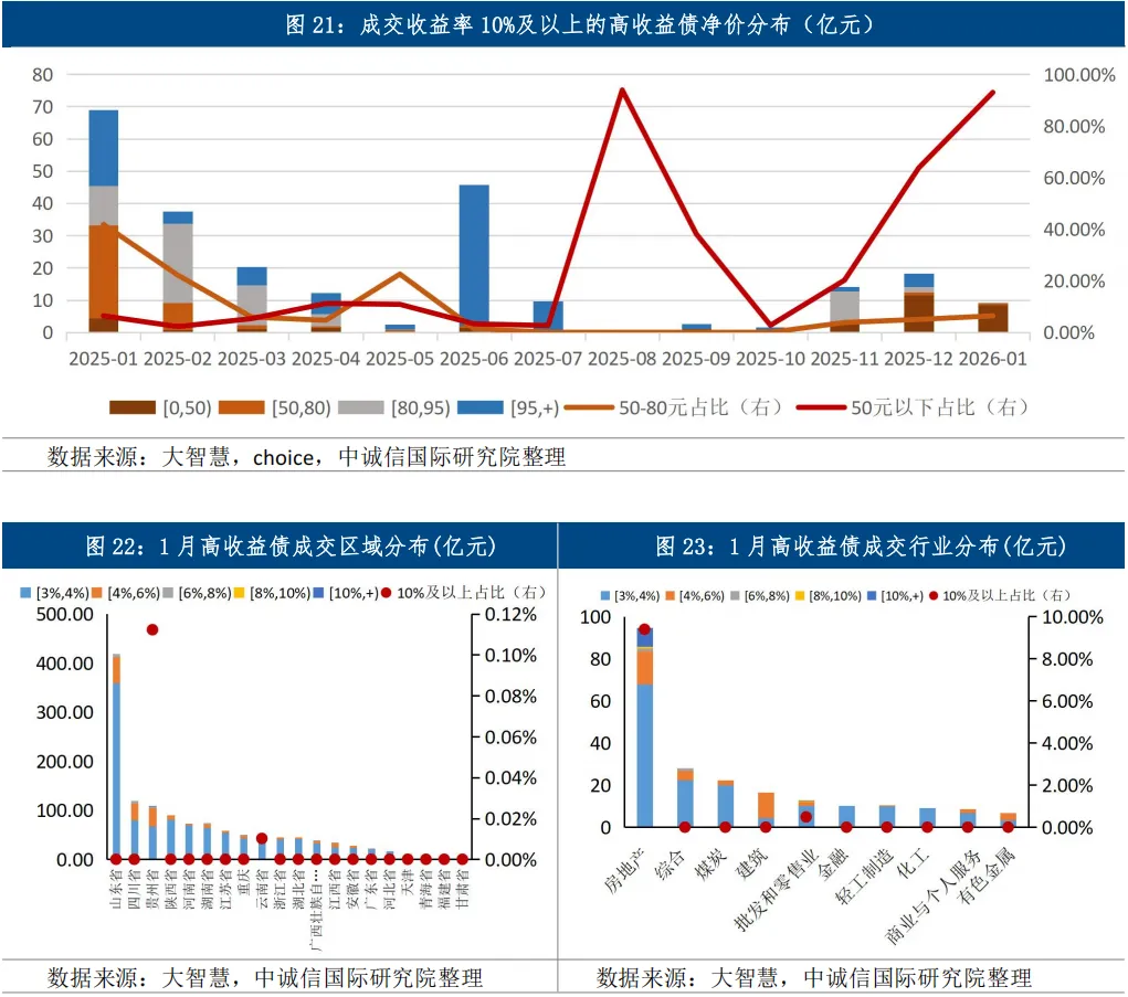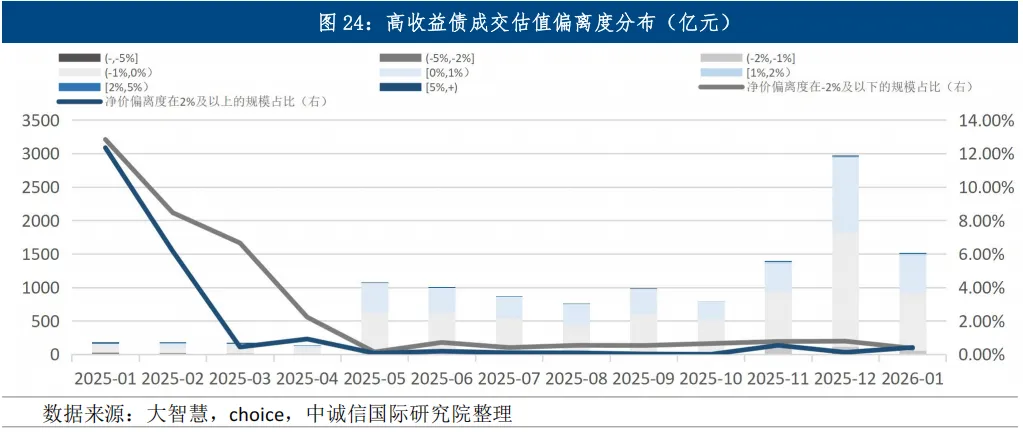 从交易价格来看,低估价成交占比有所减少。1月高收益债成交价低于估价净价的成交规模占比为61.23%,虽较去年12月减少0.32个百分点,仍占据多数;从净价偏离度来看,-2%及以下的成交规模占比环比减少0.42个百分点至0.36%,而2%及以上的成交规模占比增加0.29个百分点至0.41%,净价偏离度绝对值在2%以内的成交规模占比超99%,市场整体趋于平稳。