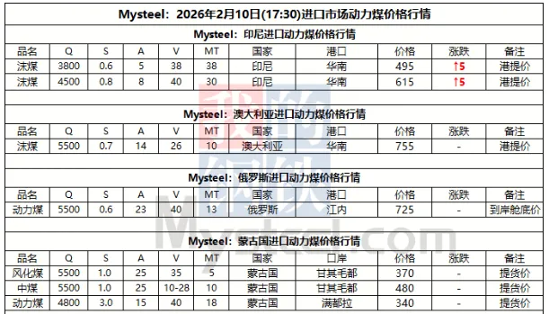10日进口市场动力煤价格偏强运行。国际市场方面,近期虽部分头部矿山RKAB全额审批,但部分中小型矿山仍面临减量问题,当前市场流通资源稀少,供应修复仍需一定时间,故矿方挺价情绪浓厚,在行情波动较大下贸易商暂缓操作,实盘固定报价较少,多以谨慎观望为主。高卡煤方面,由于印尼供应短期紧缺,部分需求向澳煤分流,在国际煤价强势运行下,澳煤价格坚挺上扬,Q5500大船FOB报价80-82美元/吨,实际成交情况一般。国内市场方面,沿海电厂继续释放3月进口煤采购需求,个别电厂已招至4月初,华南区域电厂Q3800投标区间围绕480-490元/吨左右,最低价较上期上涨30元/吨,但目前电厂日耗处偏低水平,库存压力较小,在价格大幅上涨下拿货或以谨慎为主,需持续关注印尼实际供应及成交情况。