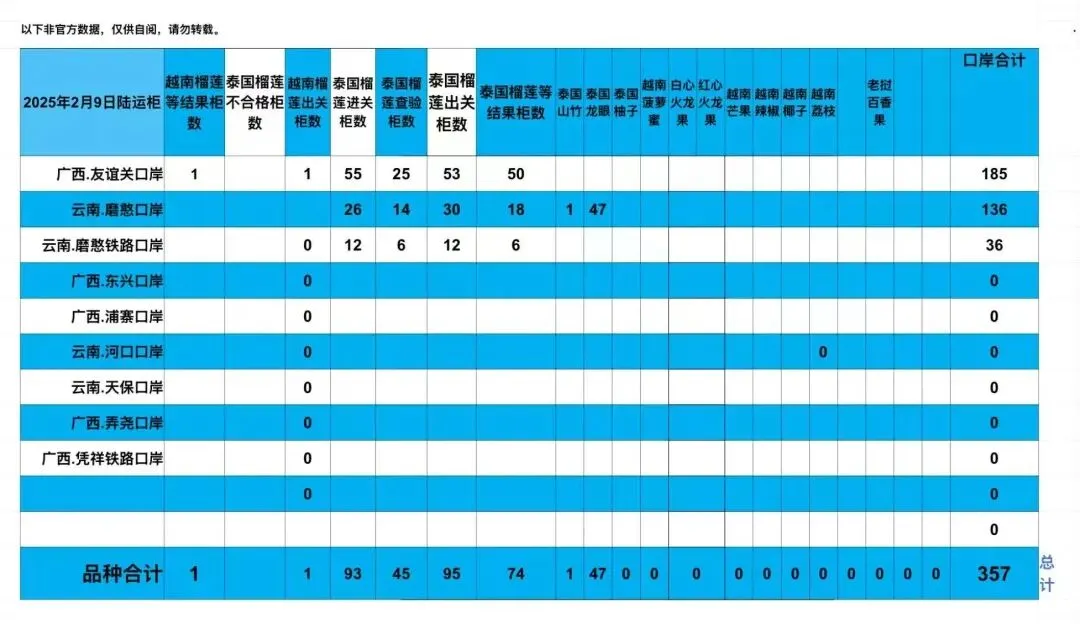 陆运口岸数据越南榴莲总出关数据:18柜/15柜。泰国榴莲总出关数据:105/107柜。