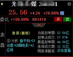 再跟大家分析一下今天影视院线板块的走势和后续机会。今天板块整体拉升力度超预期,除了光X、博N,上H电影、横D影视等多只个股也纷纷涨停,横D影视更是创出历史新高,形成了明显的板块效应。结合节前行情来看,春节档预售持续升温,中金公司预测,2026年春节档票房有望达到65-85亿元,行业景气度持续回升,影视院线板块的行情还没结束。