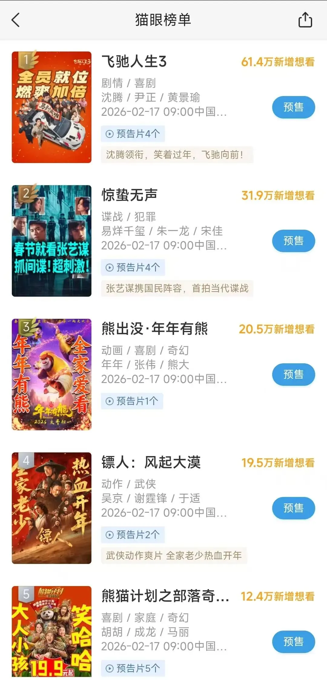 再看基本面,这波上涨绝对不是瞎炒概念,而是有实打实的业绩和行业逻辑支撑。根据同花顺今日推送的实时资讯,2月9日春节档正式开启预售,截至今天10时,预售总票房已超8600万元,而2026年春节档更是被誉为“史上最长春节档”,共有8部影片定档,题材涵盖喜剧、谍战、动画等,受众覆盖面极广。其中,光X传媒参与出品的《飞驰人生3》《惊蛰无声》《熊猫计划之部落奇遇记》均定档大年初一,还重映《重返·狼群》,手握多部热门影片;博N影业则参与出品了韩寒执导的《飞驰人生3》,这部影片作为春节档喜剧头部作品,受众基础深厚,票房预期拉满,这也是凡哥当时看涨的核心原因。