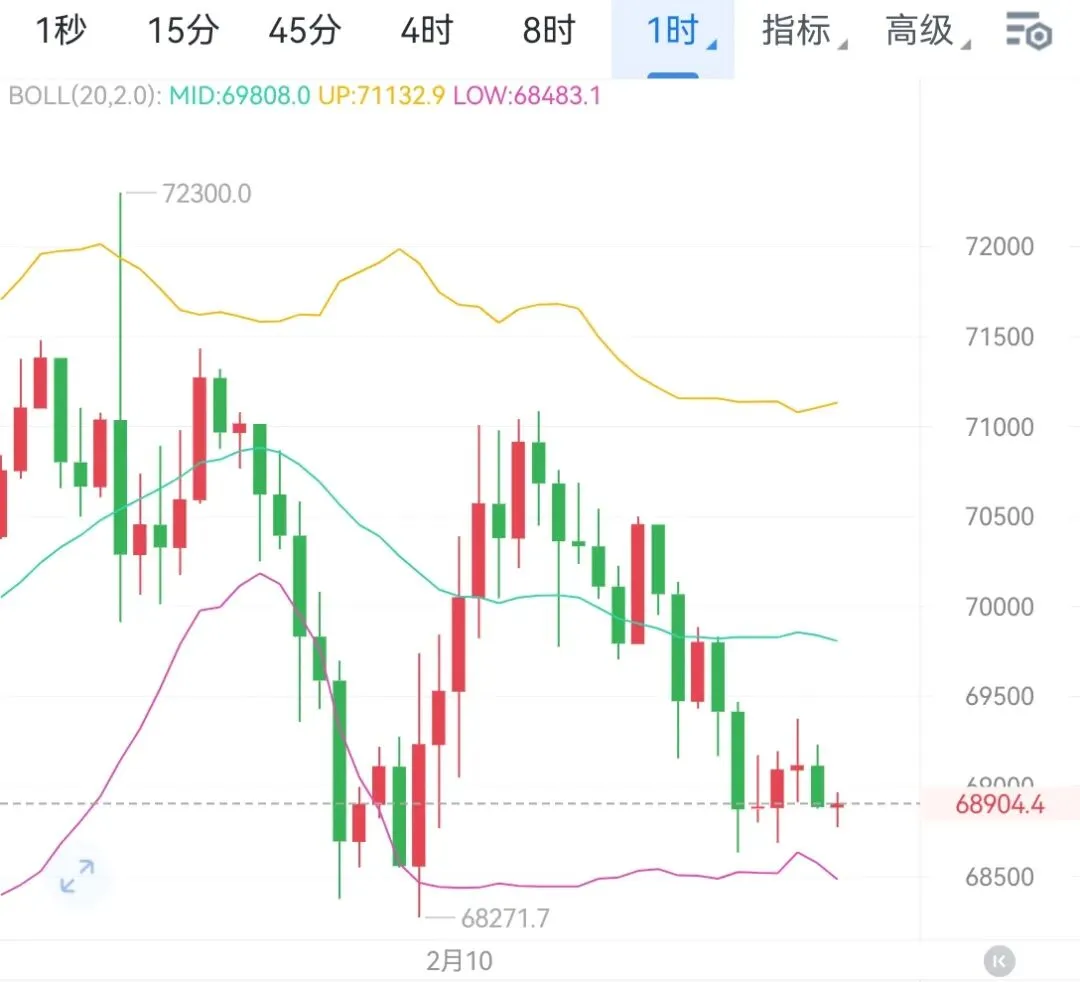 大饼多次试图上攻71000-71500关键压力区均告失败,该位置压制效果显著,每次向上触及后均出现承压回落,表明上方抛压依然沉重。短期内若再次靠近该区间,可视为顺势布空的机会。下方首先关注68000一带小级别支撑,而更为关键的大支撑位于65000附近,该位置可作为中期强弱分界线。建议在震荡中参考这一上下区间,采取分批逢高布局空单的思路。