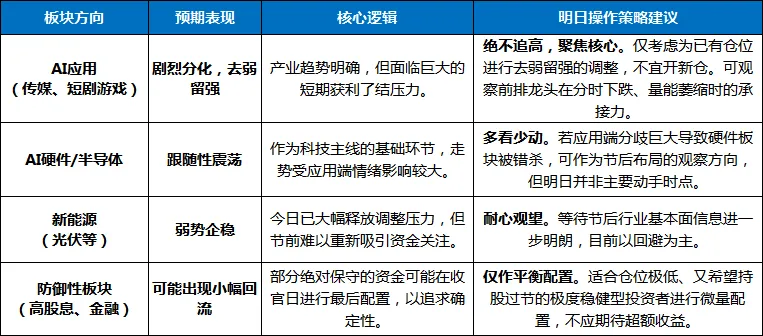 综合来看,明日市场预计将进入纯粹的“假期模式”,呈现“指数平淡、交投清淡、结构主导”的格局。指数层面难有大的波澜,核心特征将是“缩量收官,主线休整”。