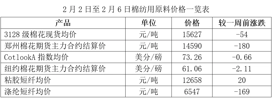 原料端:国内棉花价格震荡下降,国外棉花价格下降,粘胶短纤价格持稳,涤纶短纤价格下降。