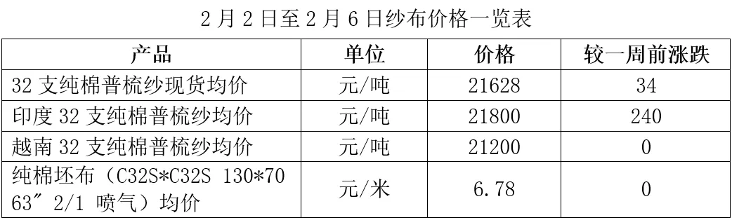 棉纱:当周,国产棉纱方面,临近春节,下游市场销购活动明显减弱,纺企陆续开始收尾工作,节前备货和交前期订单为主,新增订单稀少,整体开机下降,纯棉纱价格基本持稳,部分纱厂提高报价,但实际成交重心变化不大。进口棉纱方面,受欧美订单增加带动,印度纱外盘报价上调;越南纱、巴基斯坦纱报价持稳。具体数据,国内32支纯棉普梳纱周均价21628元/吨,环比上涨34元/吨;印度32支纯棉普梳纱现货周均价21800元/吨,环比上涨240元/吨;越南32支纯棉普梳纱现货周均价21200元/吨,同上周持平。