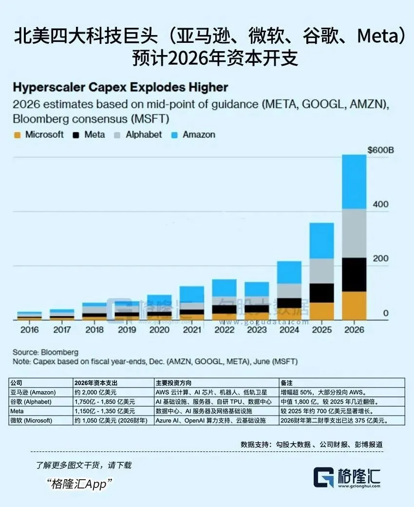 同时以英伟达链为代表的算力硬件需求日盈增加,据PB社报道,最新财报显示,谷歌、亚马逊、Meta、微软四大科技巨头预计2026年资本开支合计将达约6500亿美元(环比增长60%以上),部分公司投入超过过去三年总和,主要砸向AI数据中心与相关设备,AI基建狂潮方兴未艾,关键是服务器产能和IDC数据中心建设跟不上需求。