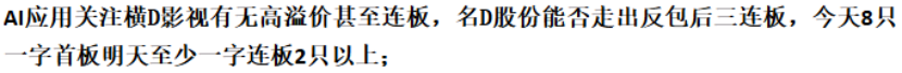 1、AI应用今天强势一字板的二板梯队需要有2只以上继续强势一字板。尤其今天最强的