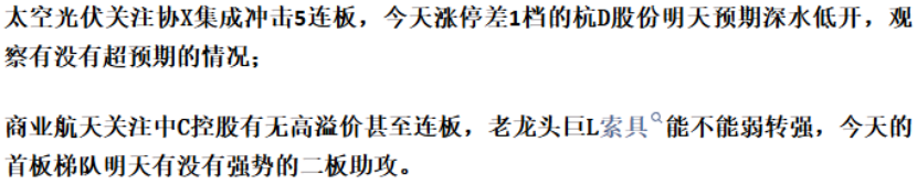 4、太空光伏,市场上聚焦了大量人气的协X集成今天虽然断板,但没有负反馈。全天有很强的资金承接并且尾盘有抢筹。今天的爆量换手也几乎把筹码重新洗了一遍牌,如果明天能够超预期反包涨停,必能带动太空光伏板块再次走强。