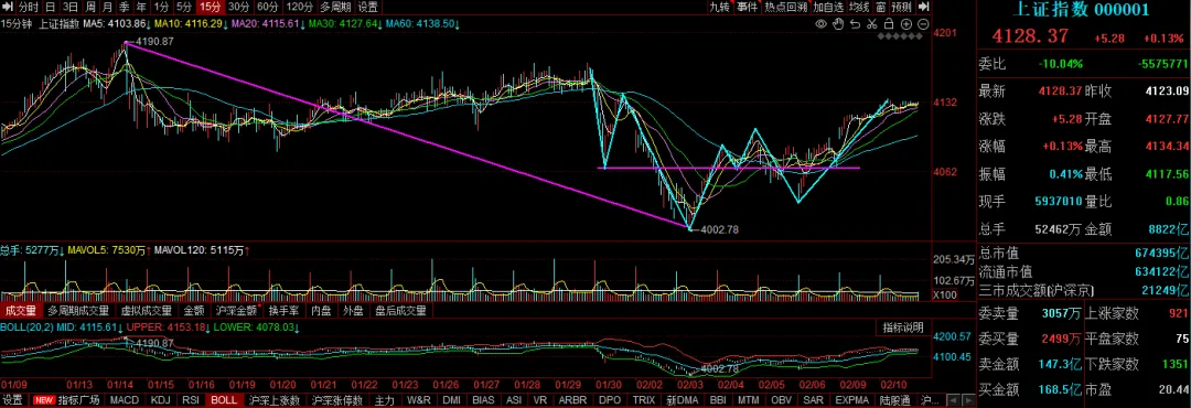 今日沪深两市成交2.11万亿,成交量较上一交易日缩量1439亿。两市实际上涨2151家,实际下跌2884家,实际涨停60家,实际跌停2家。主流资金今日净卖出441.81亿元,下图是今日资金进攻的板块路径今日市场全天呈现窄幅震荡态势,两市成交额降至2.1万亿附近,鉴于春节长假前仅剩下最后3个交易日,短线市场量能跌破2万亿概率不低,因此在AI应用端早盘批量涨停后,下午市场谨慎情绪加剧也在情理之中。虽然今日非ST涨停股家数降至60家,但封板率不降反升逼近九成,且跌停个股仍仅有2只,反映市场虽然增量资金追涨意愿相对有限,但随着此前多个热门方向的深幅调整,短期市场做空动能同样有限。不过随着指数在连续反弹后再度逼近4150点附近的前期箱体顶部区间,短期大概率或以时间换空间形式完成套牢盘消化,关注日线布林中轨线以及5周均线对指数的短线支撑力度。上证指数今日微涨0.13%,震荡幅度明显收窄,昨日分析走势能守住小三买低点就容易做出趋势.今日结构在小三买低点上方做很窄的震荡结构,但结合市场其他指数中证500指数的结构分析,当下还给不出短期走趋势的结论,因为中证500指数走势维持窄幅震荡,无法出小三买,深证成指的走势也类似,没有出小三买。因此继续跟踪后续走势的变化。当下先以震荡思路对待,短线操作不建议在冲高时去追买,可在自己看好的热点板块中寻找回调机会。总仓位建议上限控制在6成左右,建议遵循方法买点和卖点,做好手中个股的风控管理,设置好止损,参考制定的交易规则。