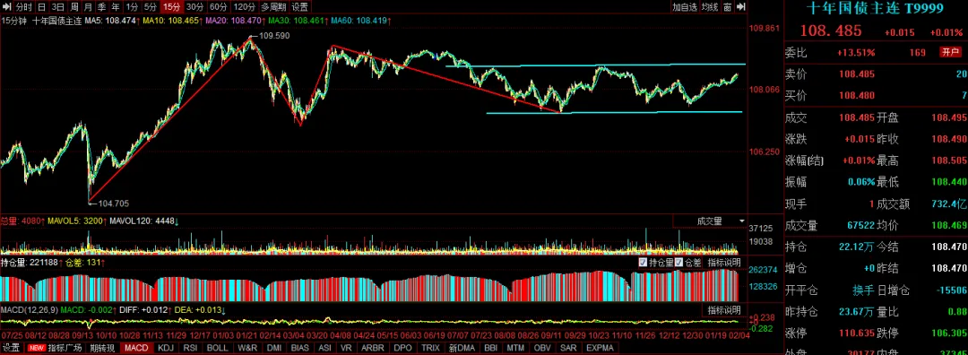 上图是十年期国债期货的15分钟K线走势图,目前15分钟是下跌一笔。1分钟上涨笔,目前股债的策略应该是债横盘,股票市场趋势向上。