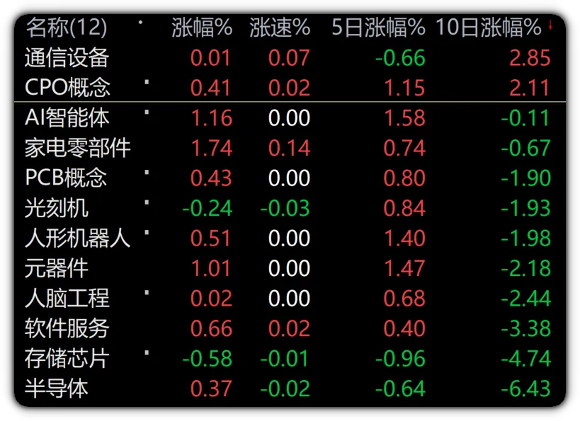 科技股方面,虽然整体还是偏弱,但也不乏稳健的通信和CPO,在前阵子比较抗跌,目前趋势仍处于右侧。