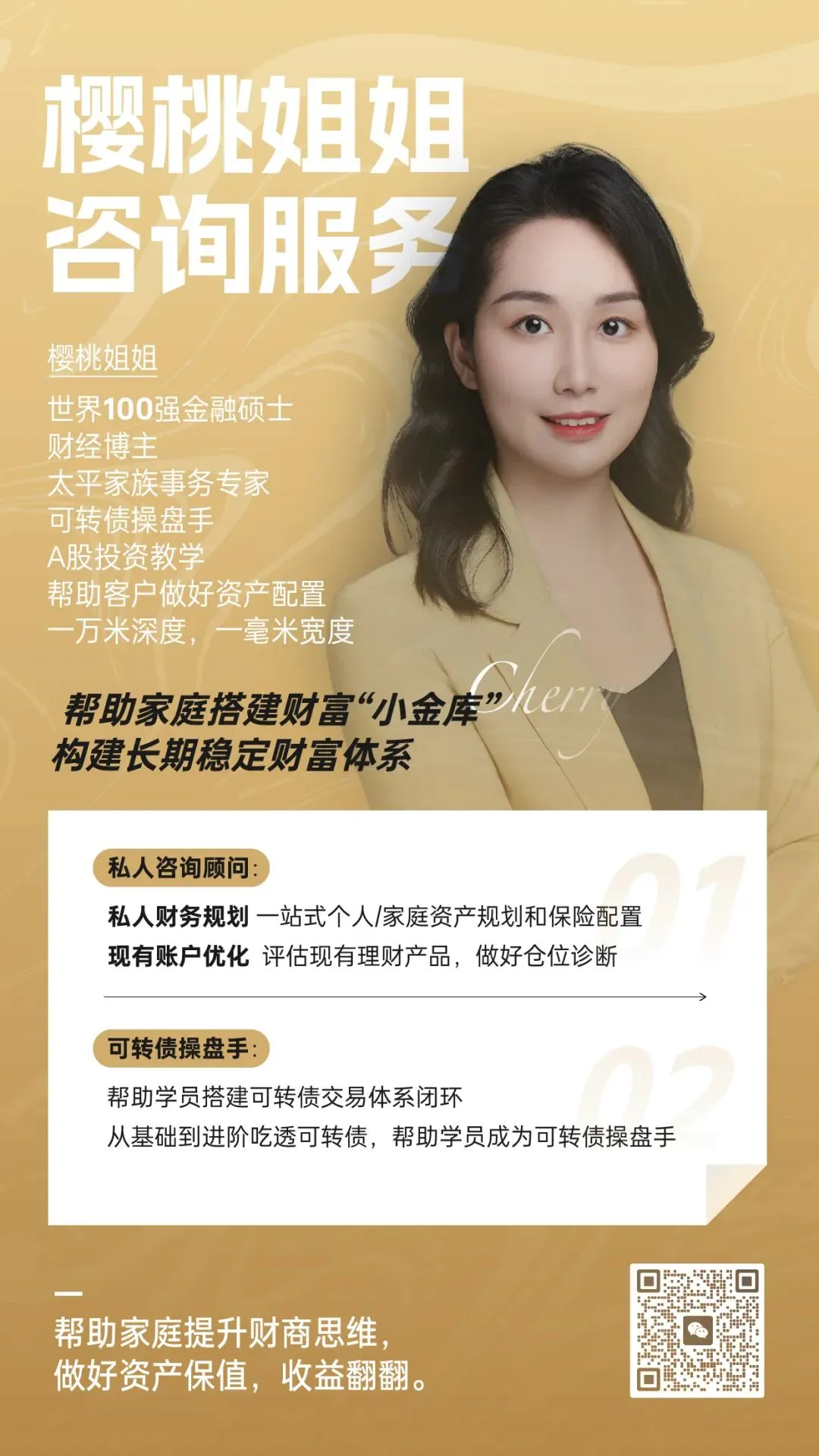 大家好,我是樱桃姐姐!我深耕投资领域,投资交易经验将近9年,核心聚焦可转债与股票两大工具,在短线波段操作与趋势交易上形成了自己的一套成熟方法论。