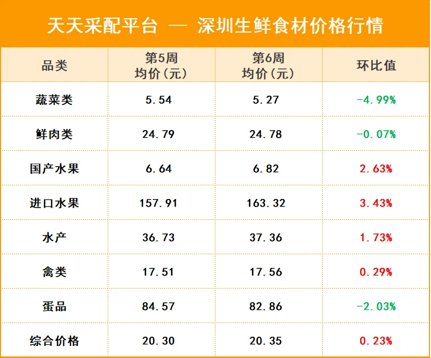 据天天采配平台数据统计,第6周水果类、水产类、禽类批发价格环比上涨,而蔬菜类、鲜肉类、蛋品批发价格环比下跌。