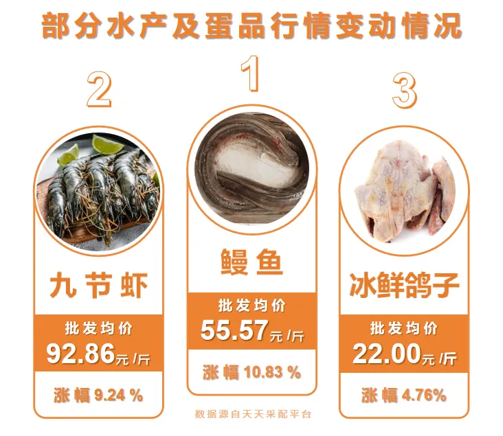 鳗鱼当前市场供货量偏少,直接带动批发价格有所上涨;九节虾受冷空气影响,市场上品质上乘的好货稀缺,再叠加春节临近、节日消费需求攀升的因素,价格也随之上涨;冰鲜鸽子则受季节特性以及节前消费需求的带动,价格出现了小幅上涨。