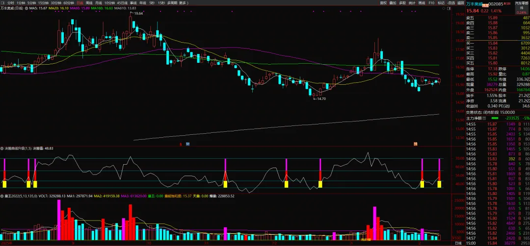 中线票:万丰奥威收涨,尾盘突然来了一个低空的利好,明天见机行事,高点减仓一些。节前拉升到16.5附近的预期不变。