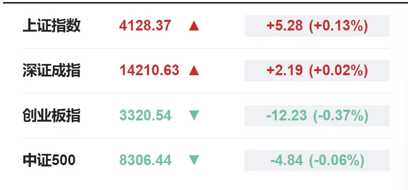 今日A股整体走势较昨日偏弱,上证指数收涨0.13%,报4128点;创业板指下跌0.37%,报3320点。