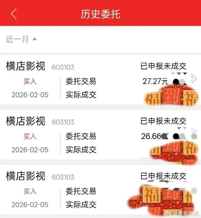 早在2月5日,我就通过自创的梧桐牛股战法,识别出这只票具备极强的爆发力,于是计划分批次挂单买入。由于开盘前事务繁忙,无法盯盘,我在当天清晨7点就提前挂单,委托价格分别设在28.5元、28元、27.5元和27元。可2月5日开盘后,横店影视并没有出现回踩,全天最低价仅28.78元,随后便直接快速拉涨停。