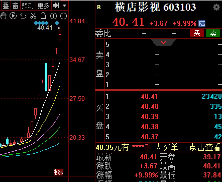 跟大家分享一只近期我精准捕捉却遗憾错失的牛股——横店影视(603103),该股最新股价为40.41元。我对此深感遗憾,核心原因就是挂单价格过低,最终没能入场。