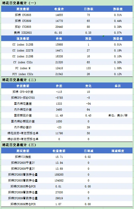 1.期权信号:CF2605合约,Call持仓192088,Put持仓154259,持仓PCR=0.80,看涨期权占优,多头情绪未完全消退;CF2609合约,Call持仓27493,Put持仓29559,持仓PCR=1.08,看跌期权占优,远月合约空头情绪更浓。