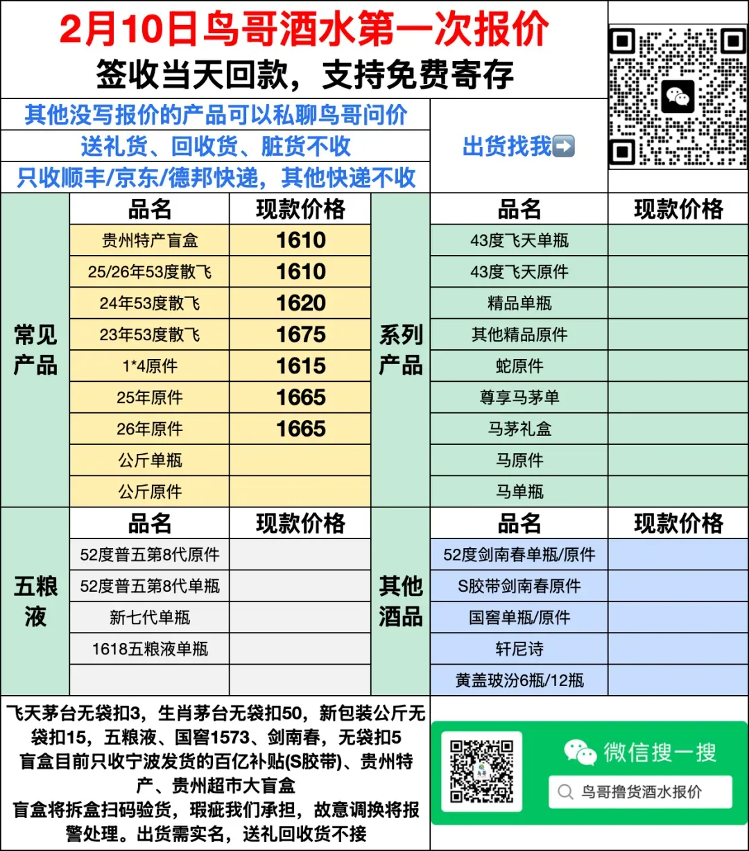 | 寄件地址:鸟哥收货小程序复制地址:回款收款:宁波地址签收后私信鸟哥报单:单号+明细到货默认出货,要寄存请提前通知!例如: SF6688548664364+ 飞天茅台盲盒双瓶*8+八代五粮液*6+出库/寄存 签收验货现款秒款 |