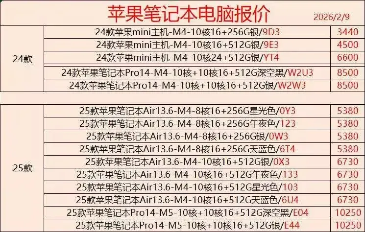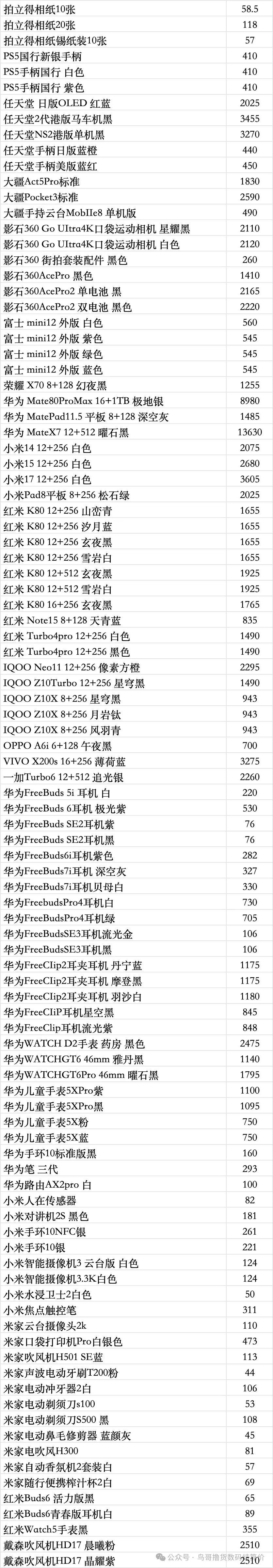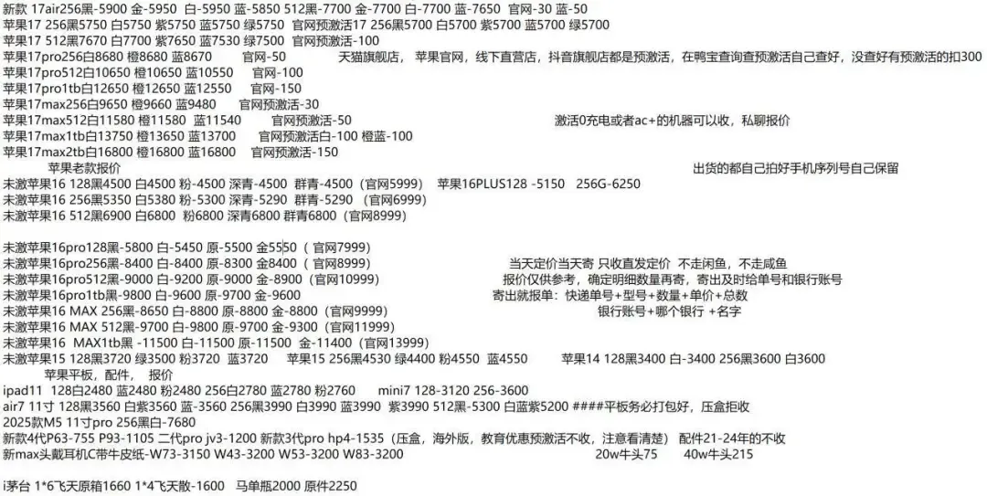任天堂oled曰版 白色1990 任天堂oled曰版 红蓝2010. 任天堂oled港版 白色1920 任天堂oled港版 红蓝1950 任天堂NS2代港版单机3250新款 任天堂NS2代港版马里奥套装3460新款(带游戏兑换码要包售后) 任天堂NS2代新加坡单机3200新款 任天堂NS2代新加坡马里奥套装3440新款(带游戏兑换码要包售后) 任天堂NS2代港版宝可梦套装3560新款(带游戏兑换码要包售后) 任天堂oled限定朱紫 曰版0 任天堂oled限定朱紫 港版0 任天堂oled王国之泪 曰版0 任天堂oled王国之泪 港版0 任天堂续航日版 彩色1450 任天堂续航日版 灰色0 任天堂续航国行 红蓝0 港版喷射战士3限定款0 日版喷射战士3限定款0 任天堂马里奥日版0 PS5国行数字0 PS5日版数字0(1209) PS5国行光驱单22款0 PS5国行光驱单23款Slim2920数字版2300 原神0000国补的一个不要 PS5日版光驱23款Slim3150数字版2700(2200A) PS5港版光驱24款slim3180港版数字slim2700 PS5PRO国行4650 PS5PRO港版5100 PS5PRO日版4650 健身环曰版320美0 健身环国行190 PS5国行手柄黑白380彩色380 保证渠道 戴森吹风机HD17晶耀紫2530 戴森吹风机HD17辰曦粉2530 戴森吹风机HD16湛蓝紫2300 戴森吹风机HD16彩陶青2300 戴森吹风机HD16落日玫瑰2450 戴森吹风机HD15黑镍色0000 戴森吹风机HD15紫红色0000 戴森吹风机HD15长春花篮0000 戴森吹风机HD15藏青铜色0000 戴森吹风机HD15黄玉橙色0000. 戴森吹风机HD15铜色0000 戴森吹风机HD08紫镍色0 戴森吹风机普鲁士兰礼盒0 戴森吹风机HD08银白0 戴森吹风机HD08礼盒大红色礼盒 (梳子套装)0 戴森吸尘器V8FE0000 戴森吸尘器V8FP0000 戴森吸尘器V8F 0000 23款 戴森吸尘器V10DS 0 23款 停收 戴森吸尘器V12DSF(U7N)0 22款 戴森吸尘器V12DSF(EGJ)2920 24款 牛皮纸完好 戴森吸尘器V12DSN 0000 戴森吸尘器V8 0 23款 大疆 大疆OSMO Pocket3标准版2580 大疆OSMO Pocket3全能套装3240 大疆ACTION4标准0000 大疆ACTION5PRO标准0000 大疆ACTION5PRO畅拍0000 大疆AC6标准2750 大疆AC6畅拍3280 大疆360标准0000 大疆360畅拍0000 佳能 索尼相机 ZV1索尼相机0000 影石系列 影石GO3S 64黑0000白0000 影石GO3S 128黑0000白0000 任何国补和消费卷还有来历不明的货,不要粉来,后果须自负 品相差的请明天叫人上门退货 国补机器不要发我 任何品牌,包括游戏机和戴森都不要,不要掺进来,一切由自己承担 2026年2月10日 华为配件全系列 行情参考 以结算价为准 所有货都不收国补的,一经发现就当送我们的 华为手表系列 华为 Watch FiT4 黑545白525绿555紫545银575 华为 Watch FIT4 pro 黑1150蓝1105绿1185 华为WATCH FIT 2活力款 黑色325粉325 华为WATCH FIT 3 黑435灰525月光白435原野绿445粉435薄荷绿445蓝435珍珠白475 Watch D2 黑 2785白2675蓝2685 Watch D2 药房版 2445 Watch buds 黑1135卡其色 1205 GT4 41m 白 795黑695草木绿00 GT4 46m 黑845棕00绿 00 Watch 4 黑 00褐 00白 00 Watch 4pro 棕 00火星钢00蓝00太空探索 00 Watch 5 46m 黑1860紫2180棕 2275蓝1885钛空银 2655 Watch 5 42m 黑1715白1865杏2255绿1725金2365 非凡2 黑5045蓝6045 非凡手表 黑3395蓝 00绿00 华为新款WATCH GT5系列 GT5 46黑1115蓝930棕915灰910 GT5 41 黑 955蓝890白925青865棕855 GT5pro 黑1190陶瓷2145钛钢色 1425冰川白1015 GT6 pro 黑1795棕2095钢2500 GT6 46m黑 1140灰色 1270绿色 1445 GT6 41m 黑 1065棕色 1445白色 1245紫色1055蓝1045 华为儿童手表系列 儿童4pro蓝490粉490 儿童5pro 蓝745粉735绿745紫745 儿童5X 蓝750粉750 儿童5Xpro 黑1095紫1100 儿童5 绿350紫350蓝415活力蓝350红345 儿童5星耀 粉405蓝420 荣耀手环,华为手环 荣耀手环9标准黑90蓝100紫100 荣耀手环9NFC 黑115蓝115紫115 荣耀手环10标准黑130绿135灰135蓝135 荣耀手环10NFC 黑155灰155绿155蓝150 华为手环系列 华为手环8标准黑103粉105 华为手环8NFC 黑105 华为手环9 黑155白145粉143黄 140蓝145 华为手环9nfc版 黑160白150粉150蓝150黄150 华为手环10标准 黑157粉159 华为手环10铝合金款 黑165白167蓝168紫168向新绿155原野绿155灰155 华为手环10NFC 黑185白193蓝195紫198绿188 B7 黑700灰700 华为耳机系列 华为Free Arc 绿405灰415黑415 华为 FreeBuds 7i 白320灰320粉320 华为freebuds6i耳机 白262黑270紫280 华为耳机Free clip2 黑1175白1180蓝1175 华为耳机Free clip 黑色845暖星云925紫 845玫瑰金845 华为耳机FreeBuds 5i 黑227白218蓝213 华为FreeBuds se2 耳机 白72蓝73黑73紫74 华为 FreeBuds se3 黑103金103白100 华为 FreeBuds Se4 白151黑151 FreeBuds 6 白535黑540紫530金530 FreeBuds 4e 2024款 白285银285 FreeBuds pro5 白1110银1110金1095 FreeBuds pro4 黑715绿705白730 华为CD56 pro笔 465 华为CD57 黑335白350 华为CD54S 三代笔290 华为 三代笔充电器 78 Wifi5 黑175白175青173 WiFi3 pro 265 AX3 115 AX6 new 225 AX3 pro new 197 AX3 pro WiFi7 187 BE3pro 千兆版 180 BE3pro 疾风版 167 BE7pro 390 AX2pro 100 Q6 一拖一凌宵版 465 荣耀手表 荣耀手表4pro 黑725棕825绿795 荣耀手表5pro 蓝牙版黑1075灰1075 荣耀手表5pro 插卡版黑1175灰1175 荣耀手表5Ultra黑1215棕1445钛金属1895 荣耀手表5 黑525金525 移动电源 华为22.5w se 移动电源 黑85白90 华为66w 电源 白180蓝190 |
