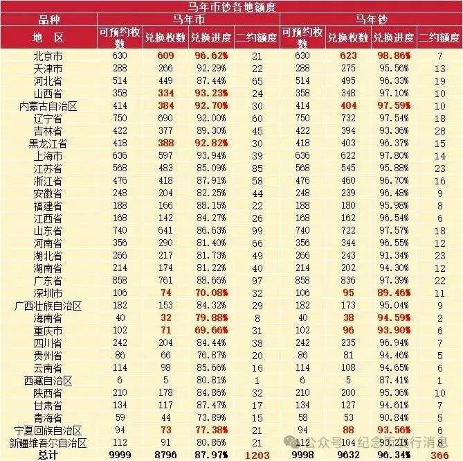 根据最新数据,马年纪念币还有1203万枚,马年纪念钞有366万张剩余,按惯例,这些剩余的数量将进行二次预约兑换。