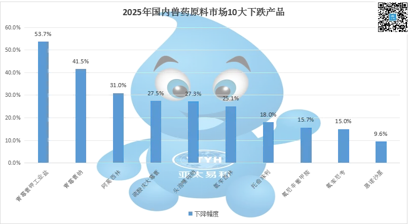 2025年已落下帷幕,兽药原料市场行情呈现显著分化,整体波动剧烈。根据亚太易和数据研究院统计,除青霉素钾工业盐跌幅超过50%外,青霉素钠、阿莫西林、硫酸庆大霉素等产品也普遍出现20%-40%不等的大幅下跌,整体市场情绪一度趋于谨慎。
