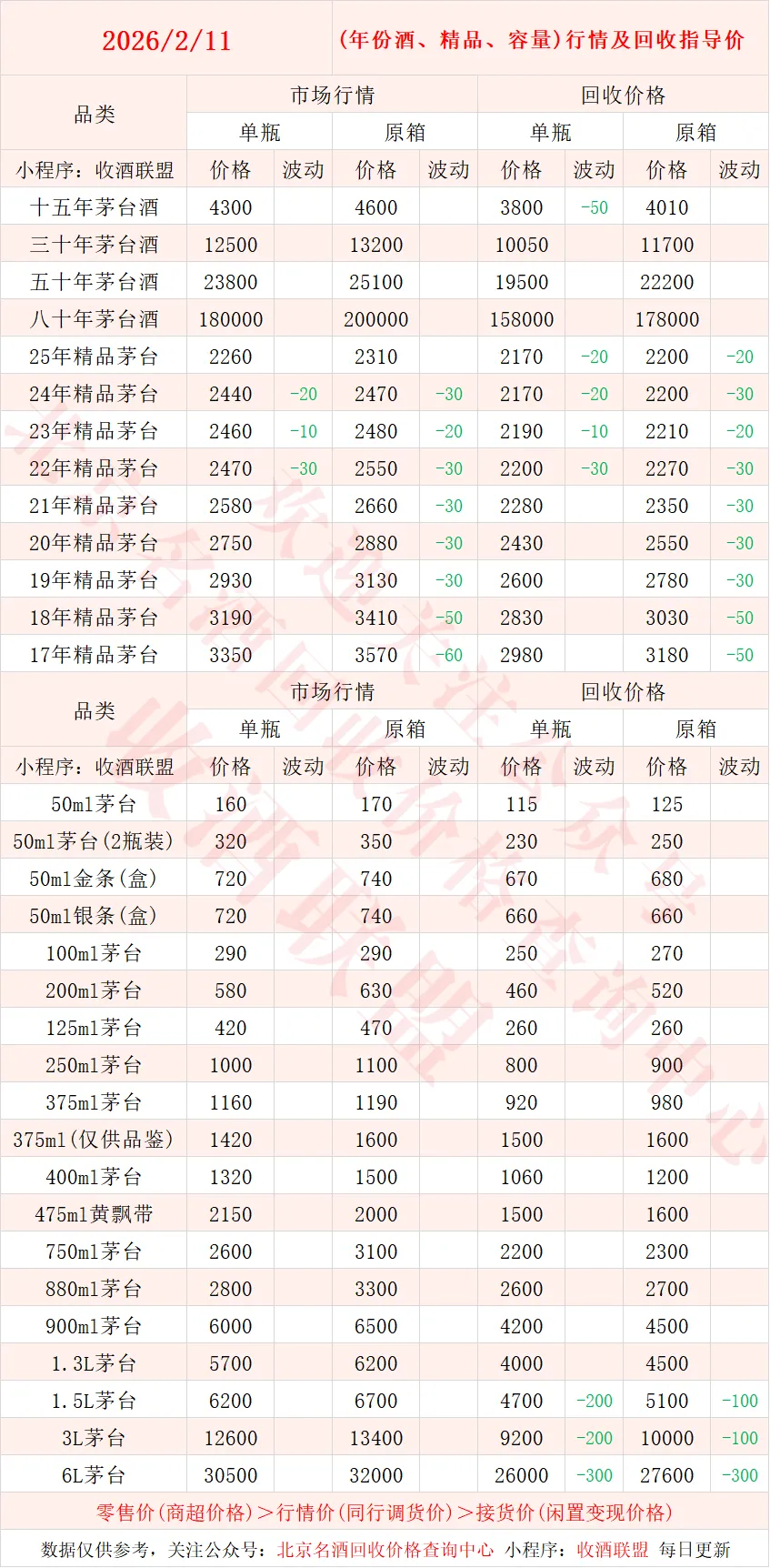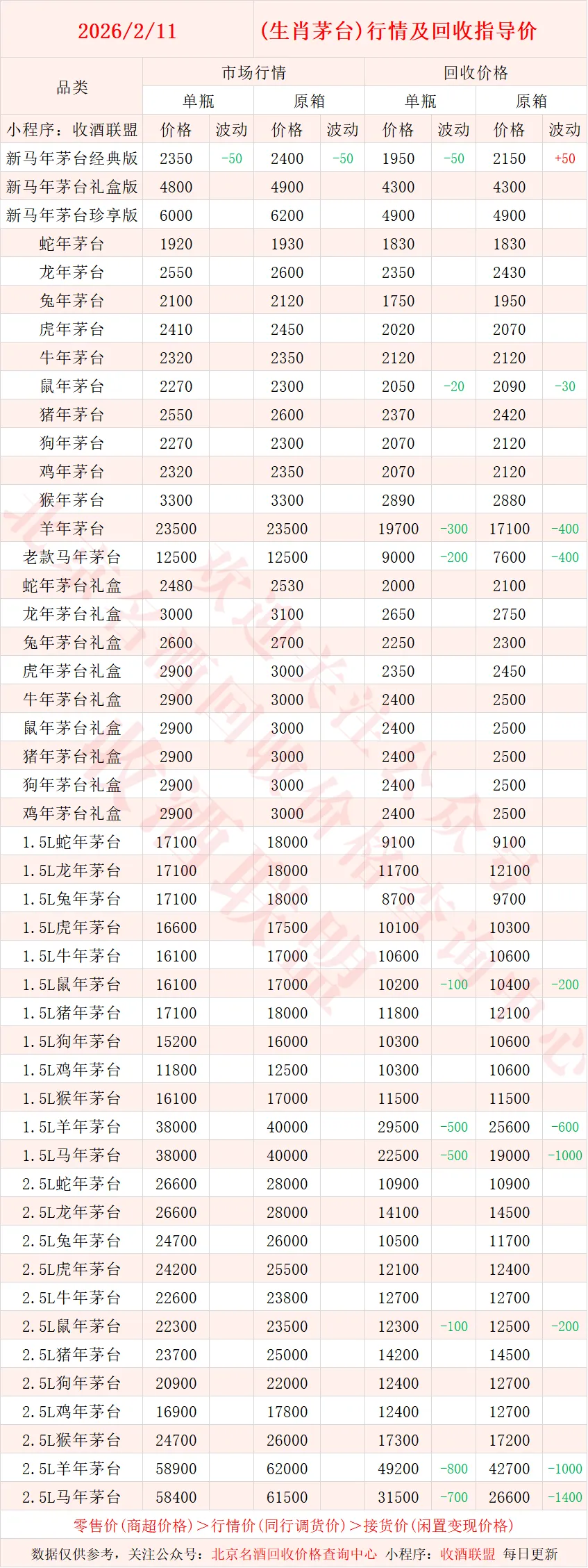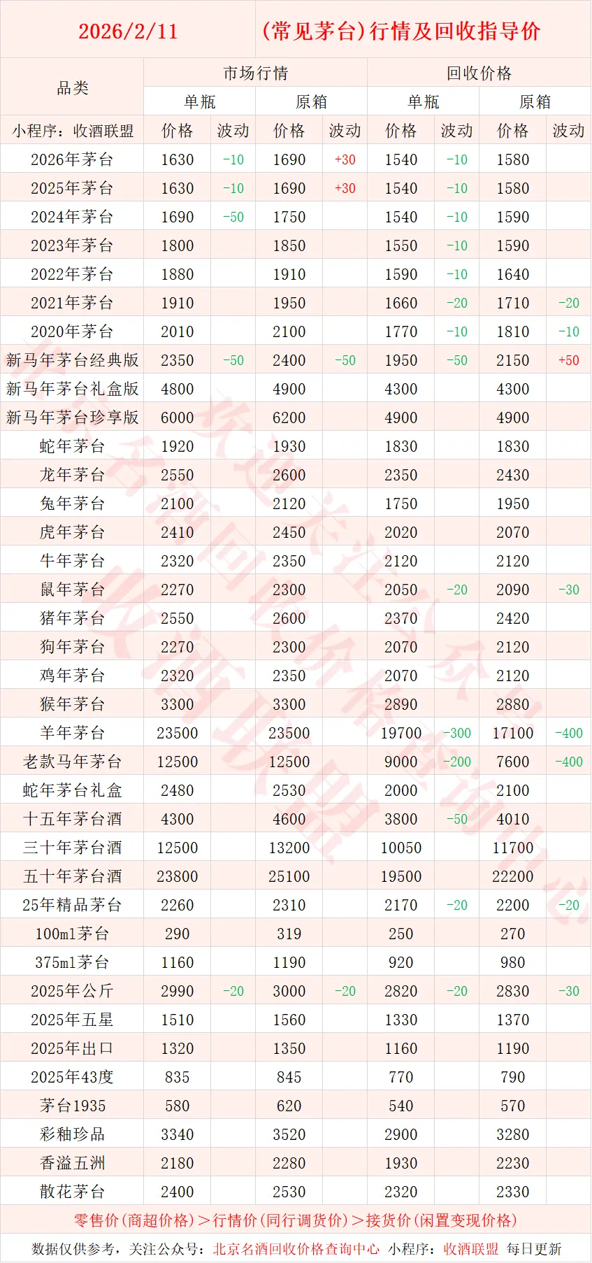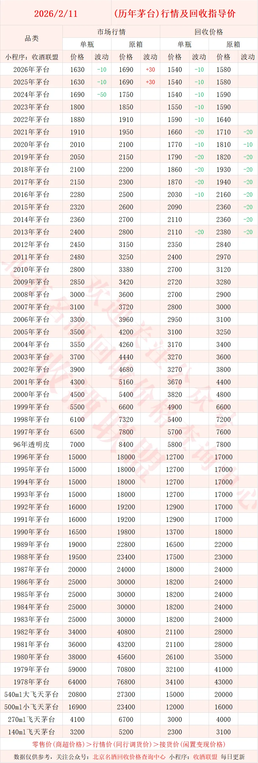 以下内容为,本公众号每日会及时更新的飞天茅台、生肖茅台、年份茅台,陈年茅台及不同毫升容量茅台的市场行情和回收报价;还包含五粮液、汾酒、剑南春、泸州老窖等国产名酒的行情及回收价,法国拉菲、木桐、玛歌等名庄红酒的回收报价,轩尼诗、马爹利、人头马等世界知名洋酒威士忌的回收参考价,每日整理不易,请点击关注支持。▪畅销类茅台行情及接货参考价▪