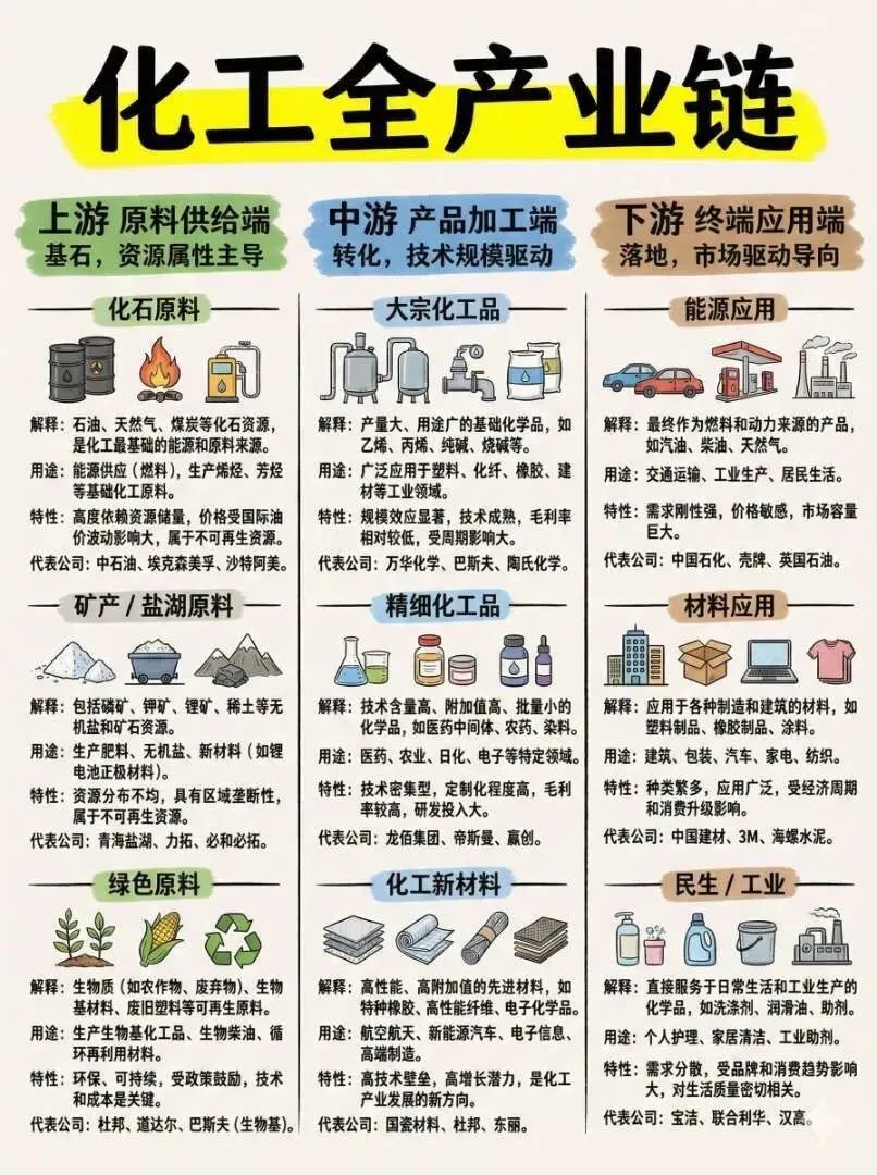当朋友圈里的化工人开始晒出“又涨了”的截图,当大宗商品价格指数一路走高,当新能源、新材料赛道的订单排到半年后,一个共识正在形成:化工行业,正在迎来新一轮的复苏周期。从上游的化石原料、矿产资源,到中游的大宗品、精细化工,再到下游的能源、材料、民生应用,化工全产业链的每一环,都在这波行情中扮演着关键角色。而最近的“化工大涨”,更像是一场行业升级的序曲,既藏着周期的力量,也预示着产业的未来。一、全产业链:化工的“骨骼”与“血脉”