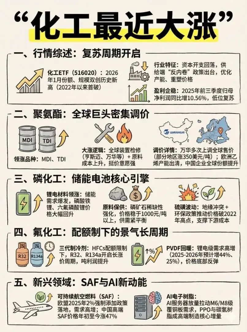 2026年开年,化工行业的“涨价潮”来势汹汹。从聚氨酯到磷化工,从氟化工到新兴领域,每一个细分赛道都在释放积极信号。1. 聚氨酯:全球巨头密集调价