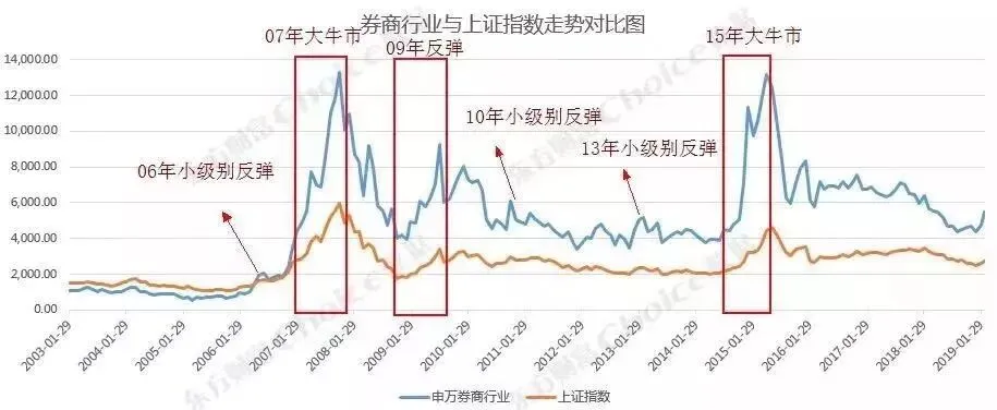 历史中,券商板块总是在牛市来临之际首先启动,从未缺席,请看由东方财富统计的数据,加入上证综合指数为参考。