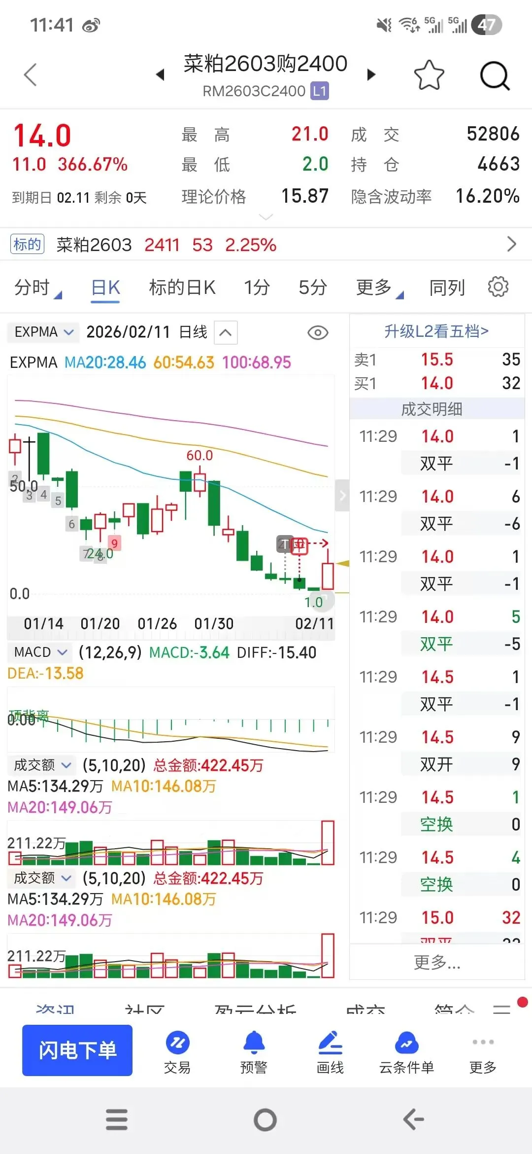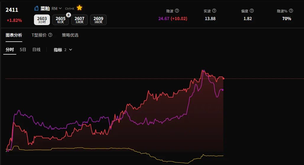 当然,“末日轮”行情具有较强的随机性,胜率较低,属于典型的“以小博大”投机机会。我近期之所以频繁参与菜系期权,正是看中其波动潜力。上周五我也曾布局认购期权,可惜当时菜粕尚未真正启动,入场时机不佳,最终未能获利。