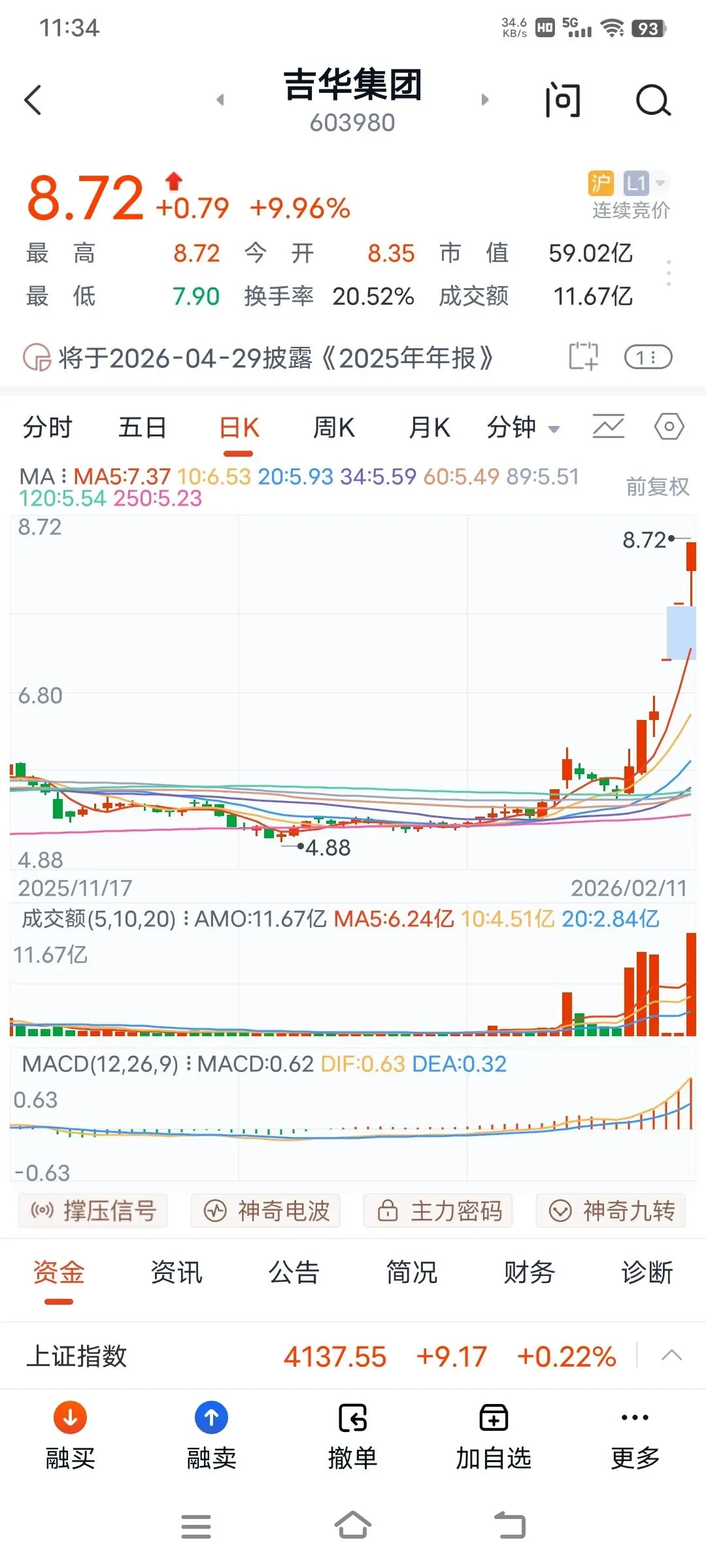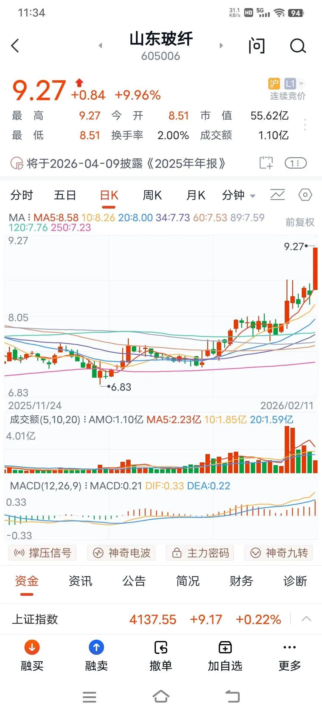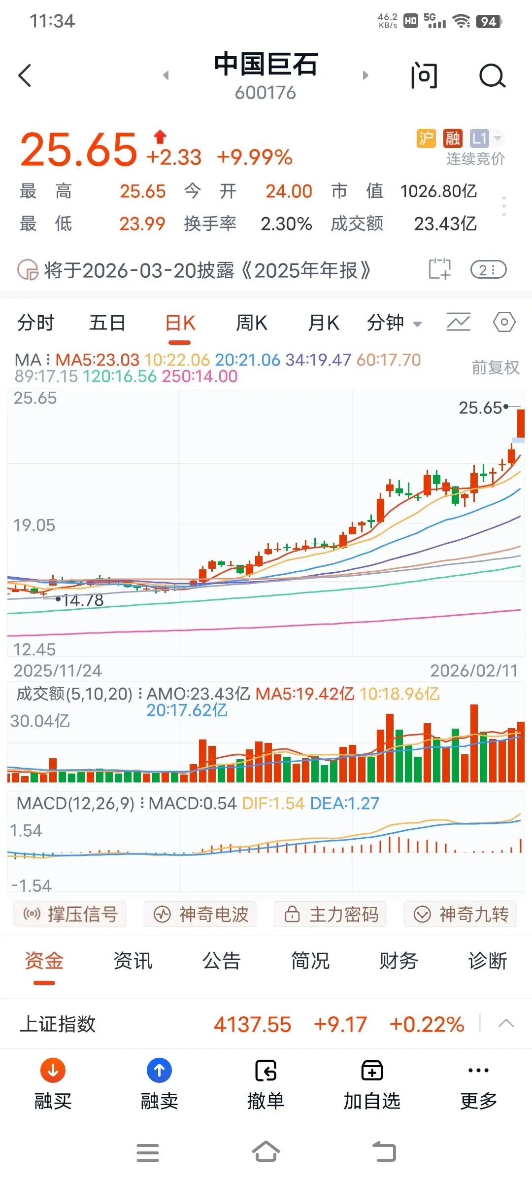 上午大盘高开高走,直接突破4138点,即使是有回调,也是盘中整理,收盘就拉升,连续7天阳线,可见国家队的良苦用心,给大家发红包行情,确保股民能够欢欢喜喜过大年。板块轮动上涨,今天上午有色金属和建材和三化板块大涨,通信设备和文化传媒都回调了,可见主力是雨露均沾,后面估计还是普涨行情,再创新高的,大家耐心持股待涨,喜迎红包行情。