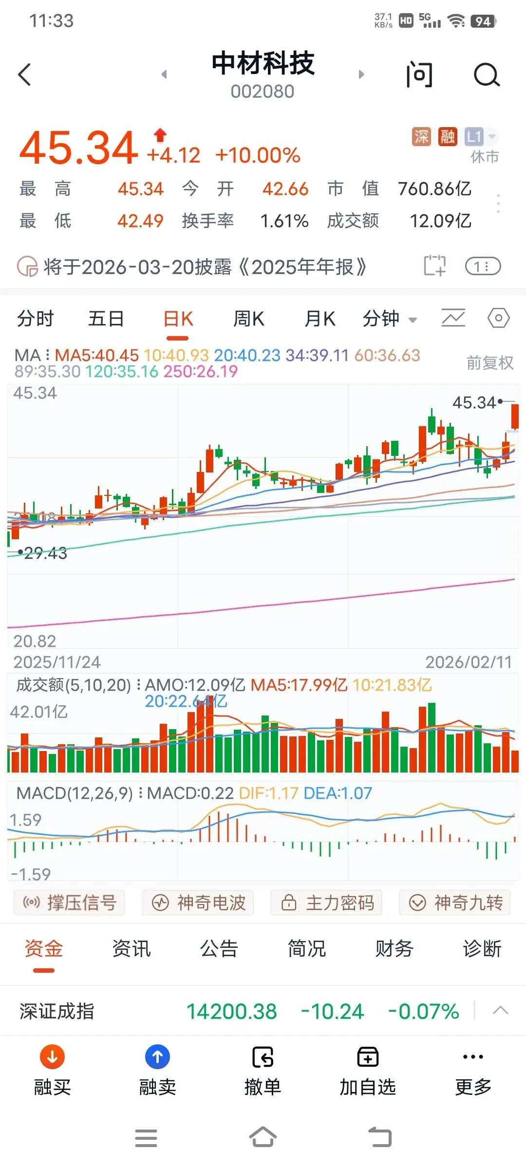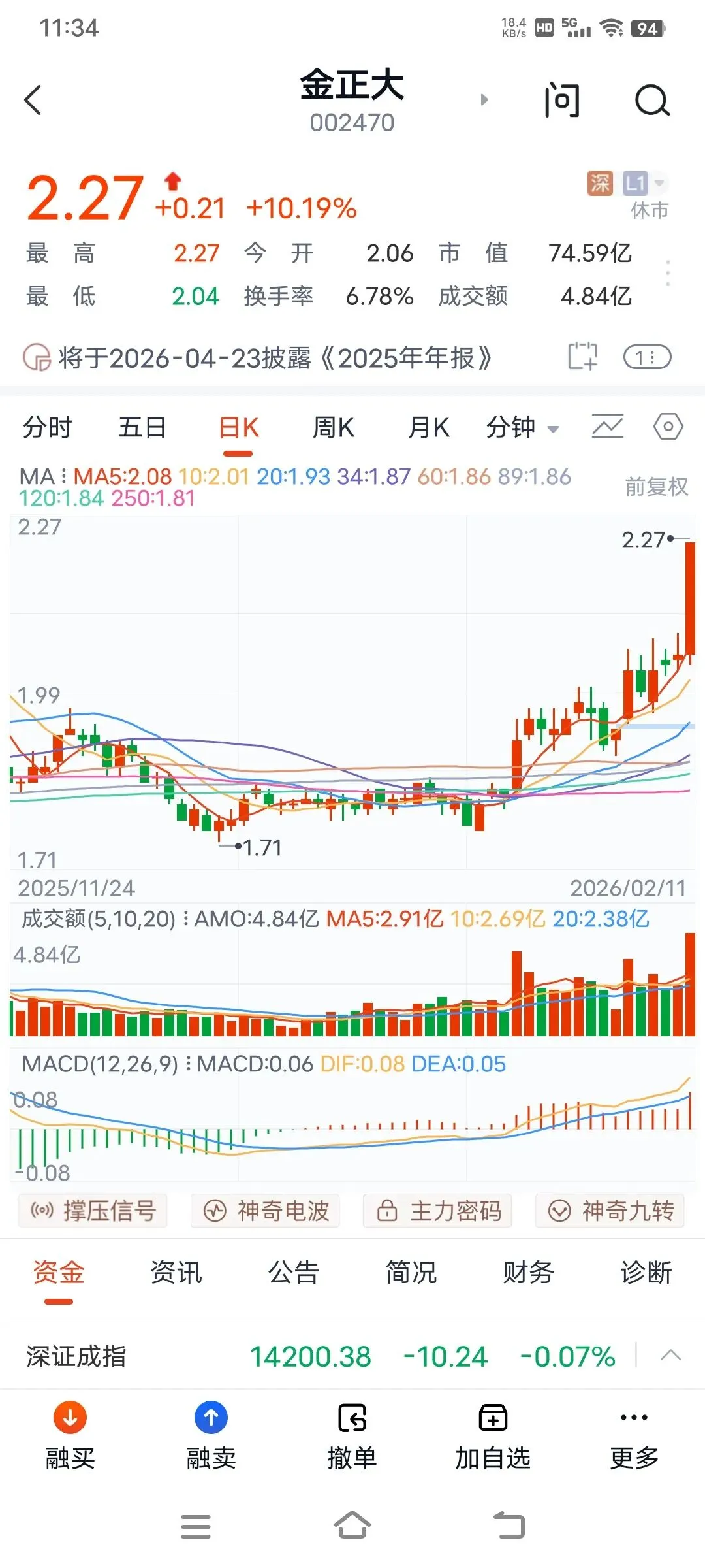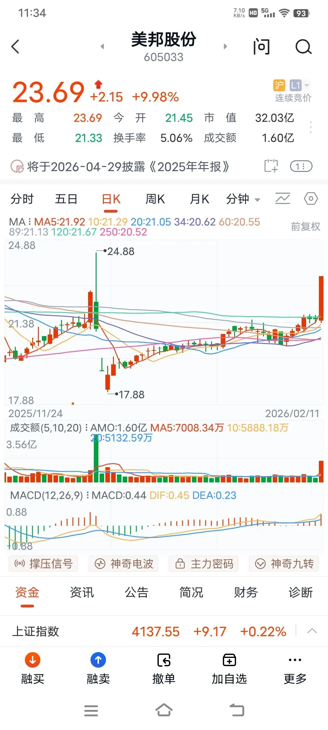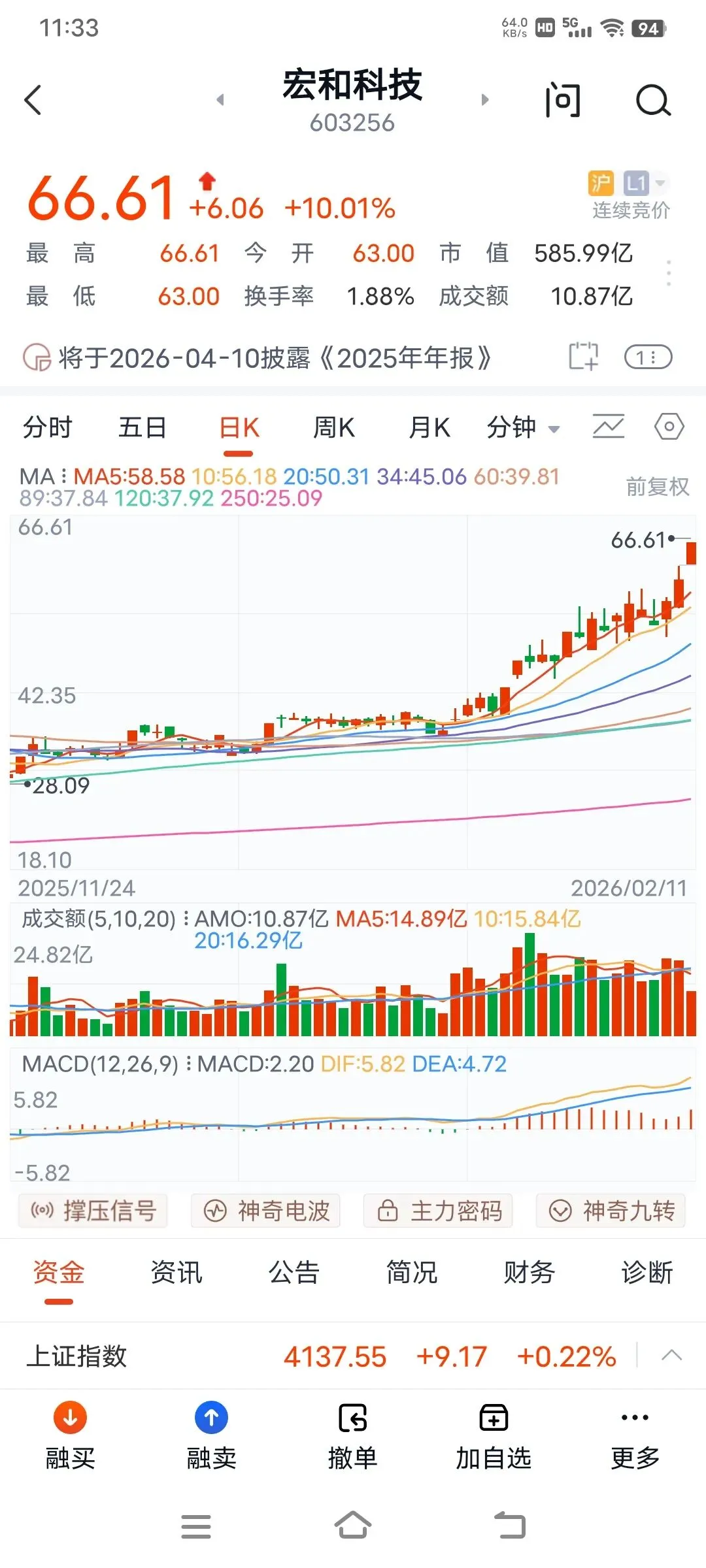 上午大盘高开高走,直接突破4138点,即使是有回调,也是盘中整理,收盘就拉升,连续7天阳线,可见国家队的良苦用心,给大家发红包行情,确保股民能够欢欢喜喜过大年。板块轮动上涨,今天上午有色金属和建材和三化板块大涨,通信设备和文化传媒都回调了,可见主力是雨露均沾,后面估计还是普涨行情,再创新高的,大家耐心持股待涨,喜迎红包行情。
