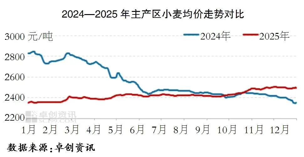 2025年四季度小麦价格走势出现分化。10月份托市收购结束,小麦下游收购主体减少,制粉需求依旧欠佳。但秋收秋播关键时期,基层出货意愿降低,降水影响流通,粮商转向玉米等秋粮作物收购,共同推动麦价上涨。11—12月,基层购销活跃度回升,部分粮商回笼资金,麦价下行压力增加,但部分区域受新季玉米品质问题影响,小麦饲用需求得到提振,且散粮市场余粮减少,粮商亏损出货意愿不足,提供底部支撑,小麦价格涨跌空间均有限。据卓创资讯数据监测,截至2025年12月31日,主产区小麦均价2497.35元/吨,较9月30日上涨70.44元/吨,涨幅2.9%,较10月31日仅上涨9.11元/吨,涨幅0.37%。