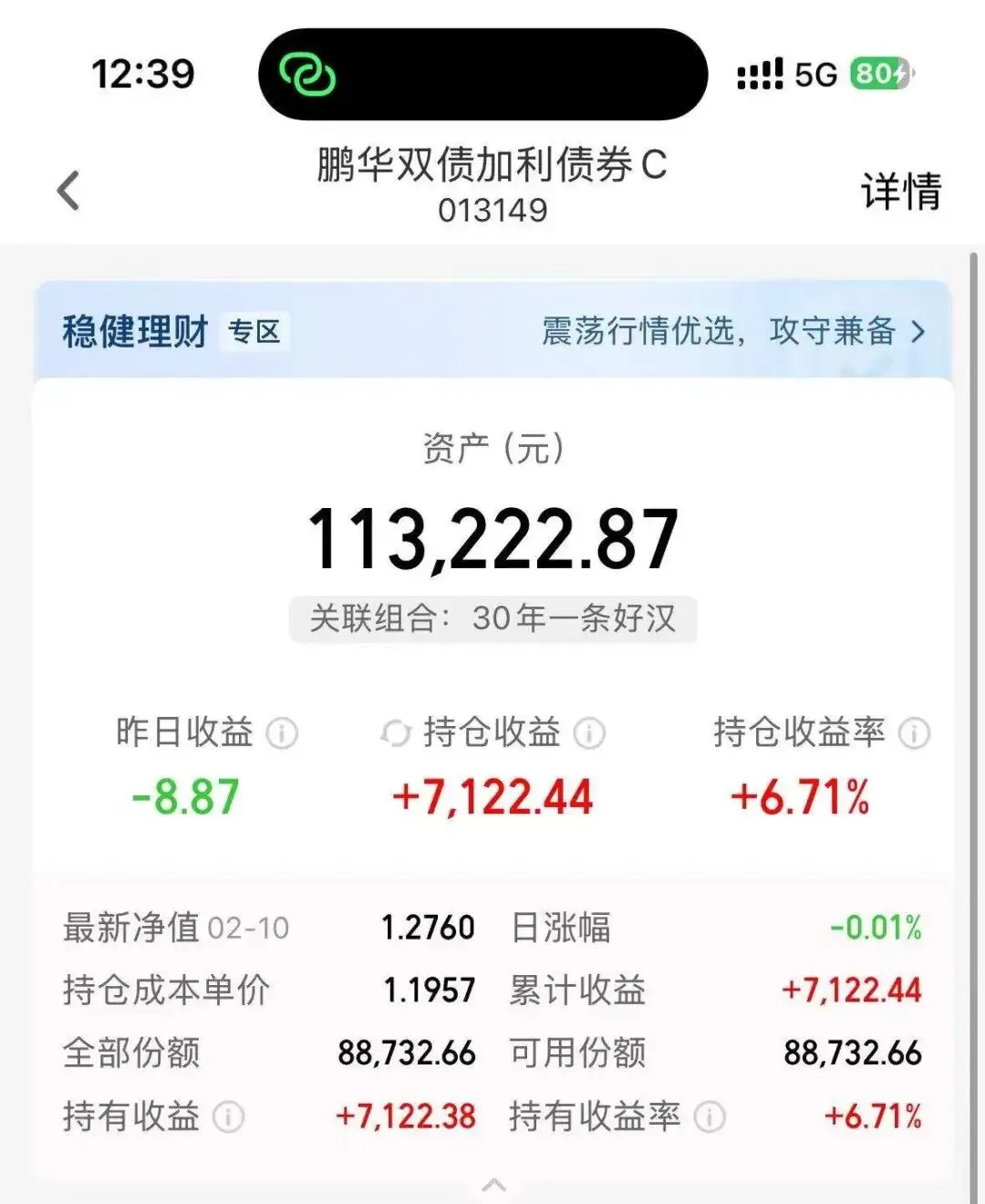 不过盈亏同源,过去一年将近20%的收益率,也主要来自股权的贡献。今年按照经理的展望,债市谨慎震荡+权益看多+可转看多,聚焦科技和周期股,转债相对保守布局生猪和银行,符合26年趋势,昨天回调1个蛋,今天过节前小加,然后等行情。