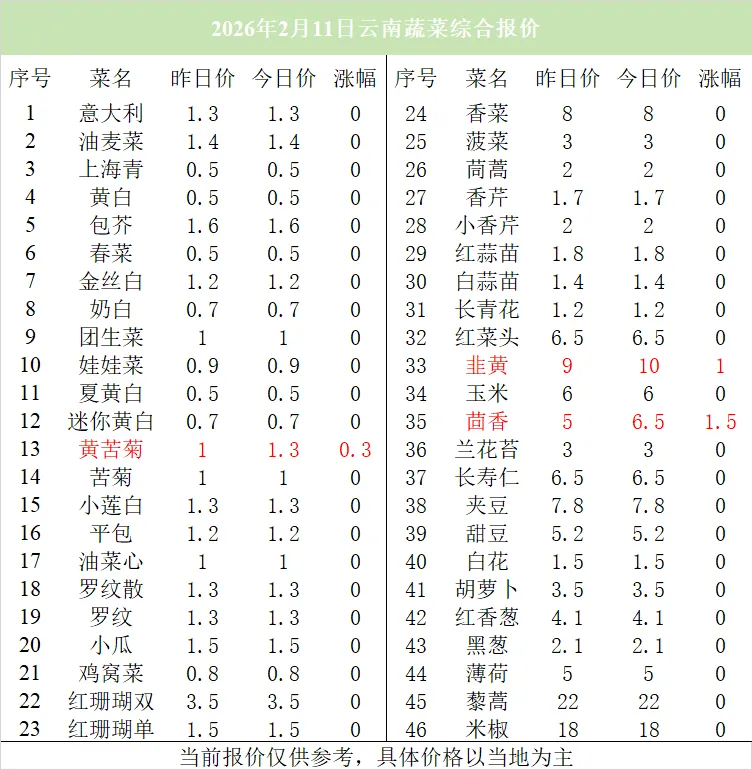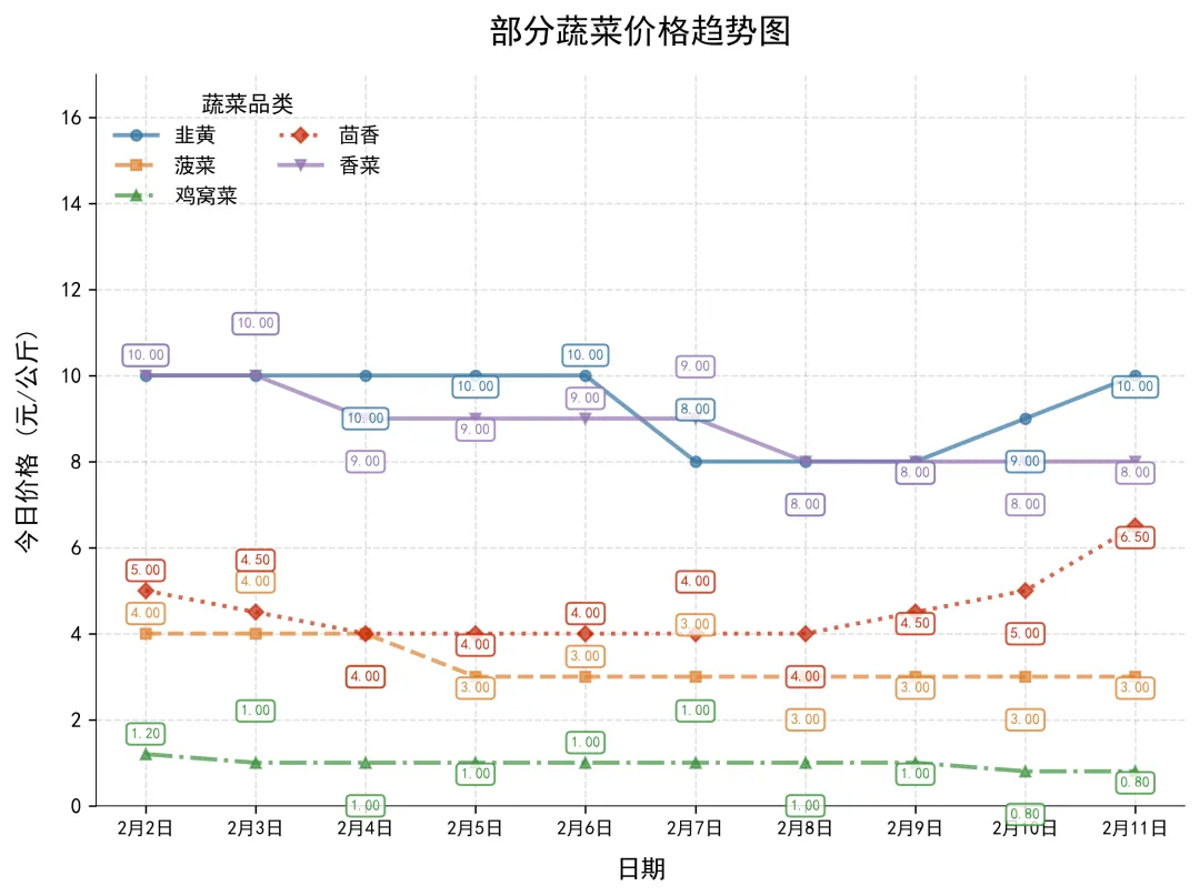 2月11日,香菜今日价格8元/公斤;菠菜今日价格3元/公斤;韭黄上涨1元,今日价格10元/公斤。茴香上涨1.5元,今日价格6.5元/公斤;鸡窝菜今日价格0.8元/公斤。
