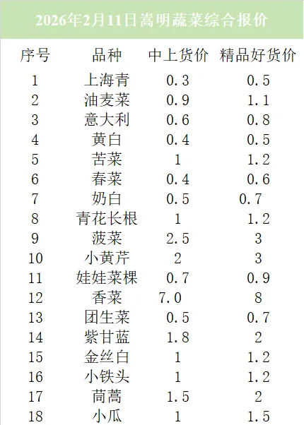 2月11日,意大利今日价格1.3元/公斤;油麦菜今日价格1.4元/公斤;上海青今日价格0.7元/公斤。黄白今日价格0.5元/公斤。